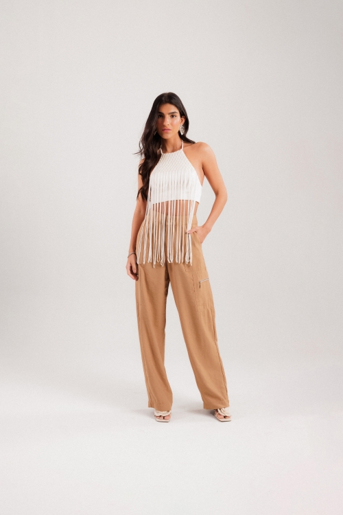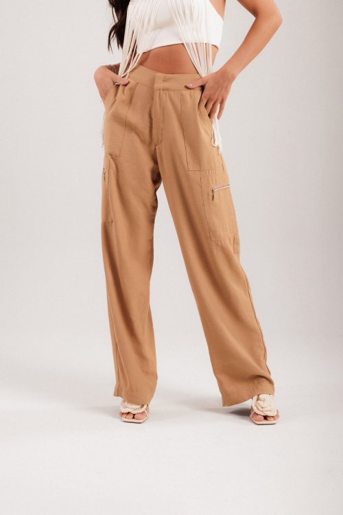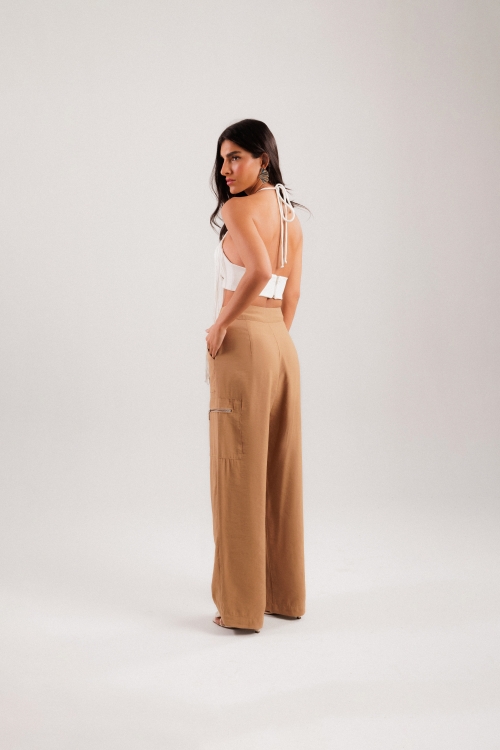 Calça desenvolvida em tecido alfaiataria de composição viscose, com bolsos laterais com zíper niquelado e forro.