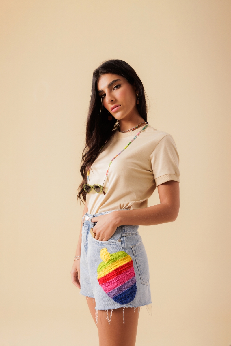 Shorts desenvolvido em tecido jeans 100% algodão, com aplicação de crochê caju, modelagem cintura alta.