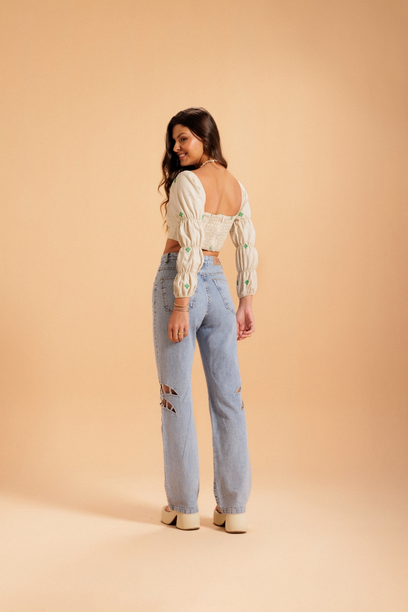Cropped desenvolvido em tecido linho com bordados e mangas bufantes.