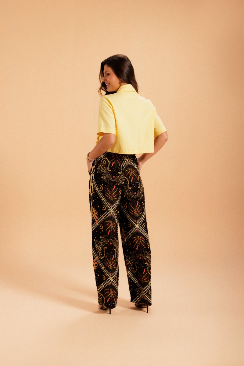 Calça desenvolvida em tecido viscose com estampa exclusiva Fille.