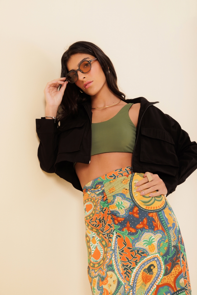 Jaqueta bomber desenvolvida em tecido alfaiataria de composição viscose com bolsos frontais.