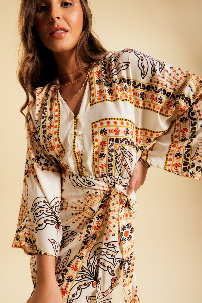 Vestido desenvolvido em tecido viscose, com saia transpassada sobreposta e estampa exclusiva Fille.