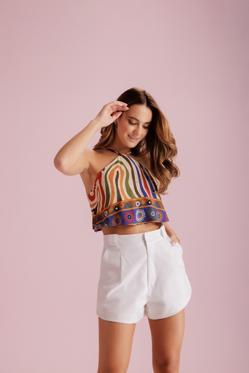 Cropped desenvolvido em tecido viscose, com amarração na costa e estampa exclusiva Fille.