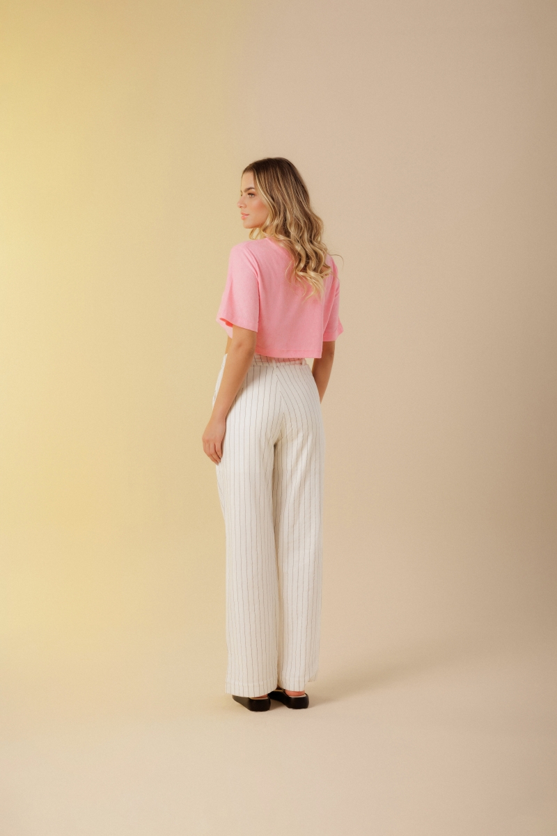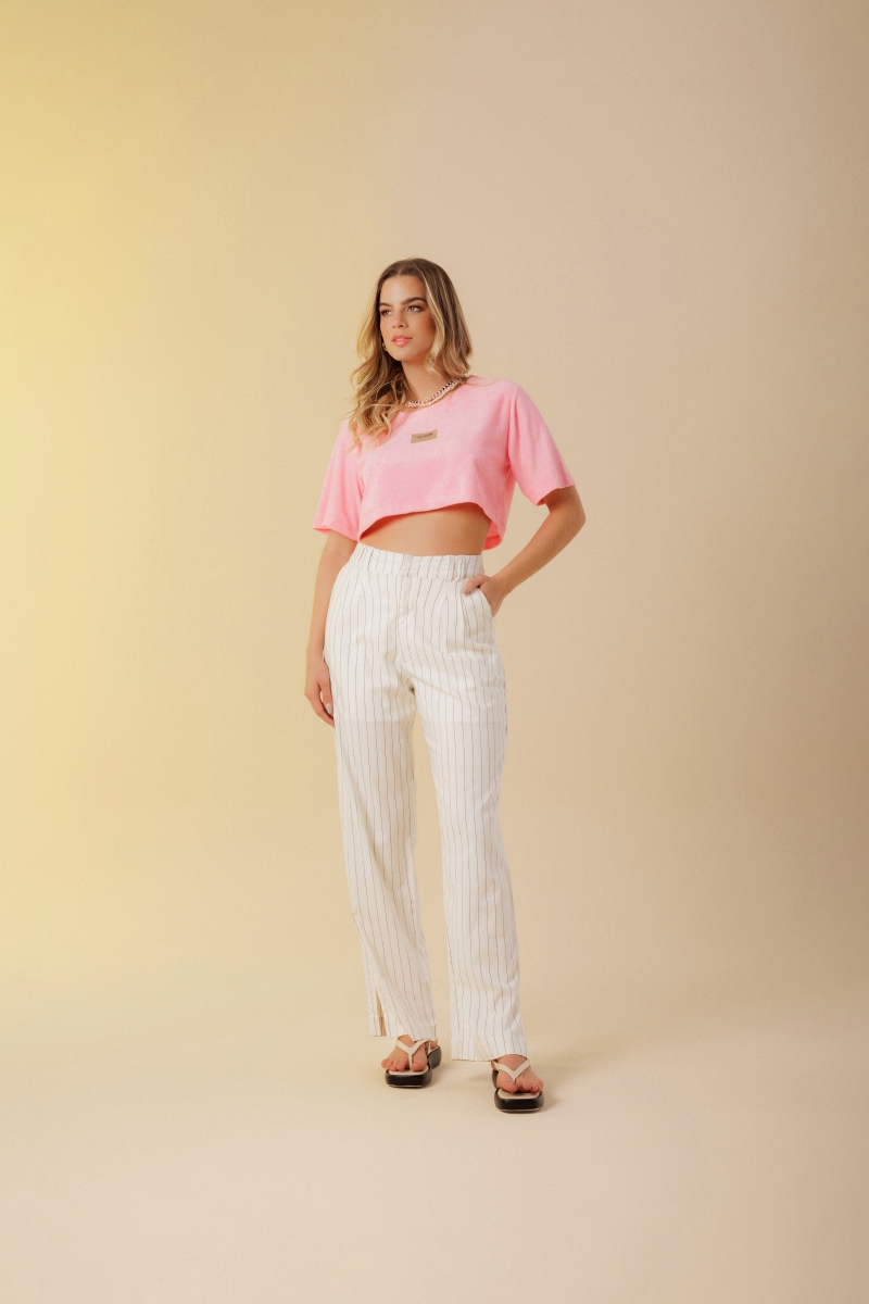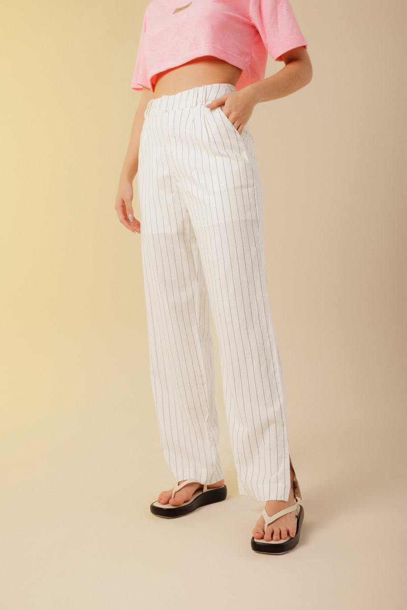 Calça desenvolvida em tecido viscose com elastano, modelagem cintura alta e pregas frontais, com fendas laterais.