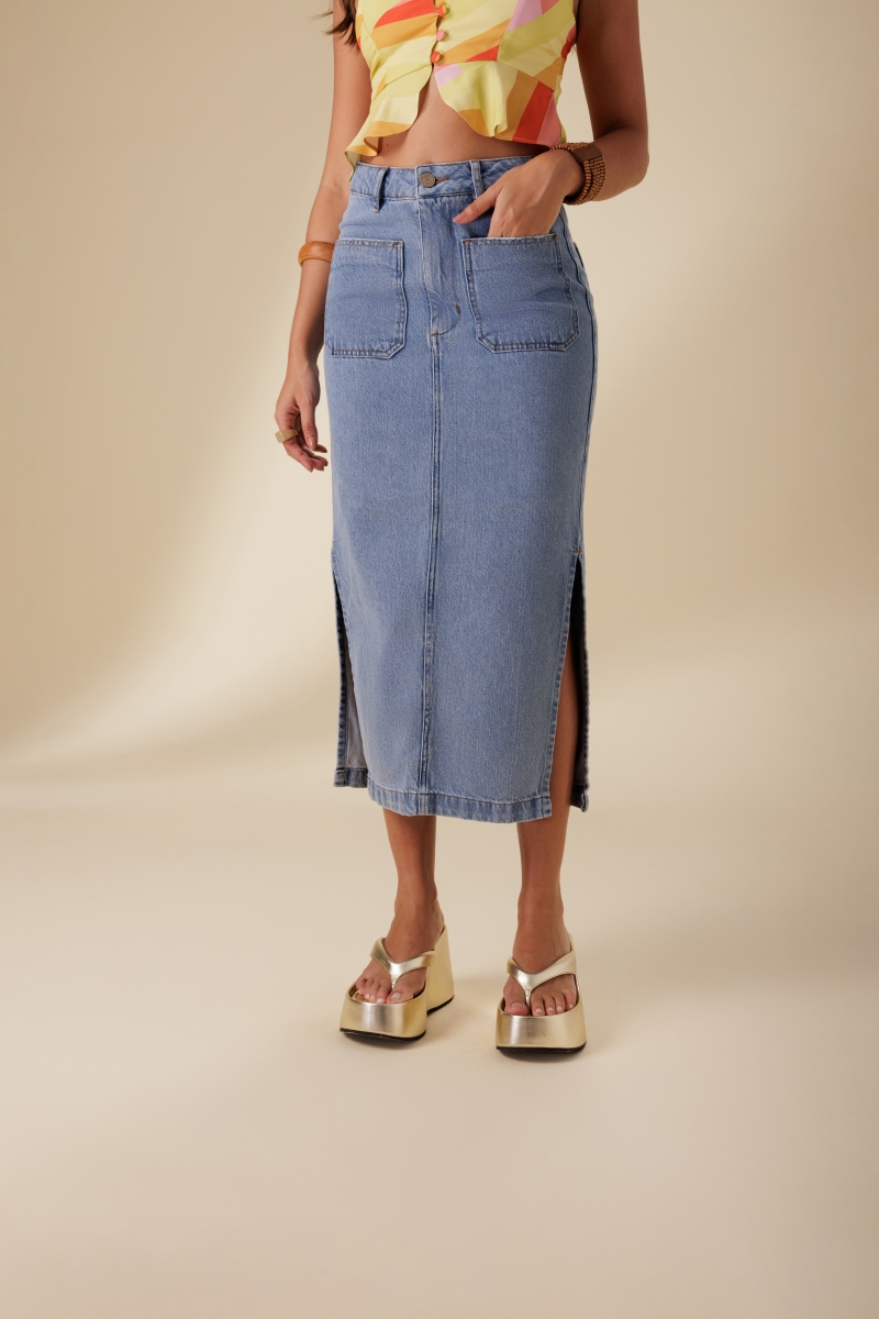 Saia midi desenvolvida em tecido jeans 100% algodão, com fendas laterais e bolsos frontais.