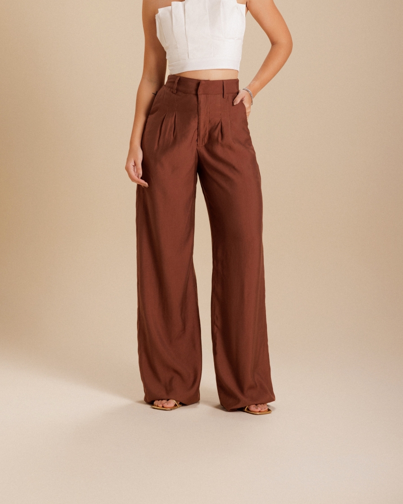 Calça desenvolvida em tecido viscose, modelagem cintura alta com pregas frontais, pantalona.