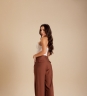 Calça desenvolvida em tecido viscose, modelagem cintura alta com pregas frontais, pantalona.