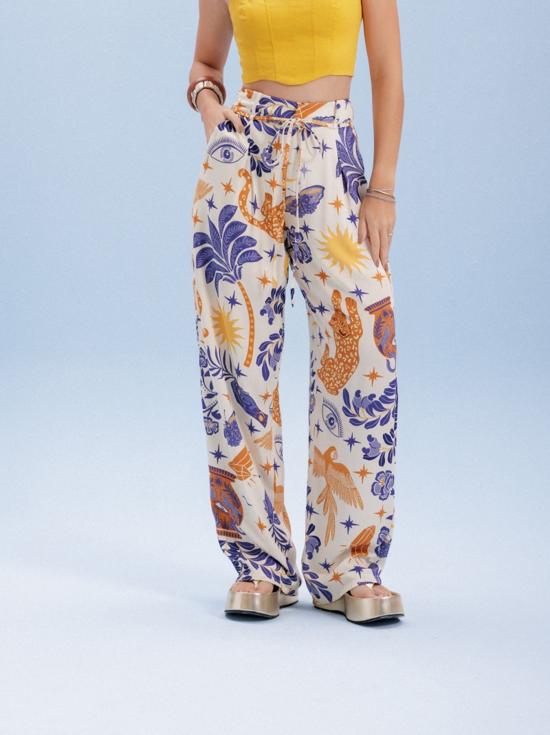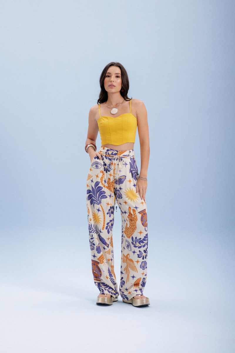 Calça flúida, desenvolvida em tecido viscose com pregas frontais e rolotê de amarração, estampa exclusiva Fille.