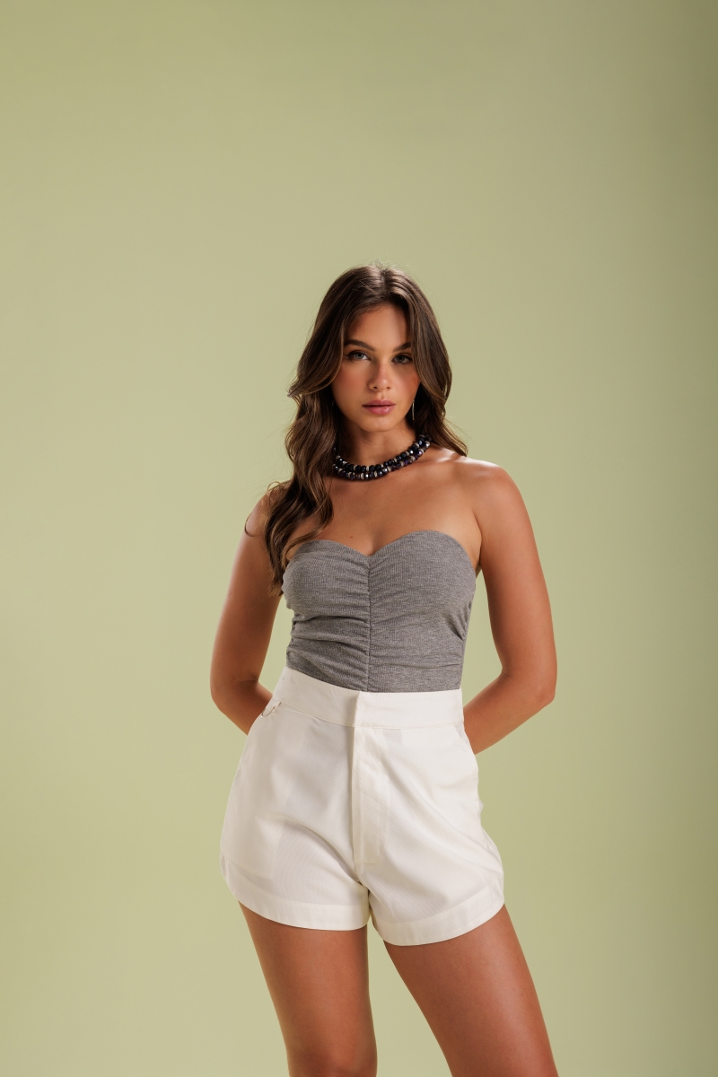 Body tomara que caia desenvolvido em malha canelada com lurex e elastano.