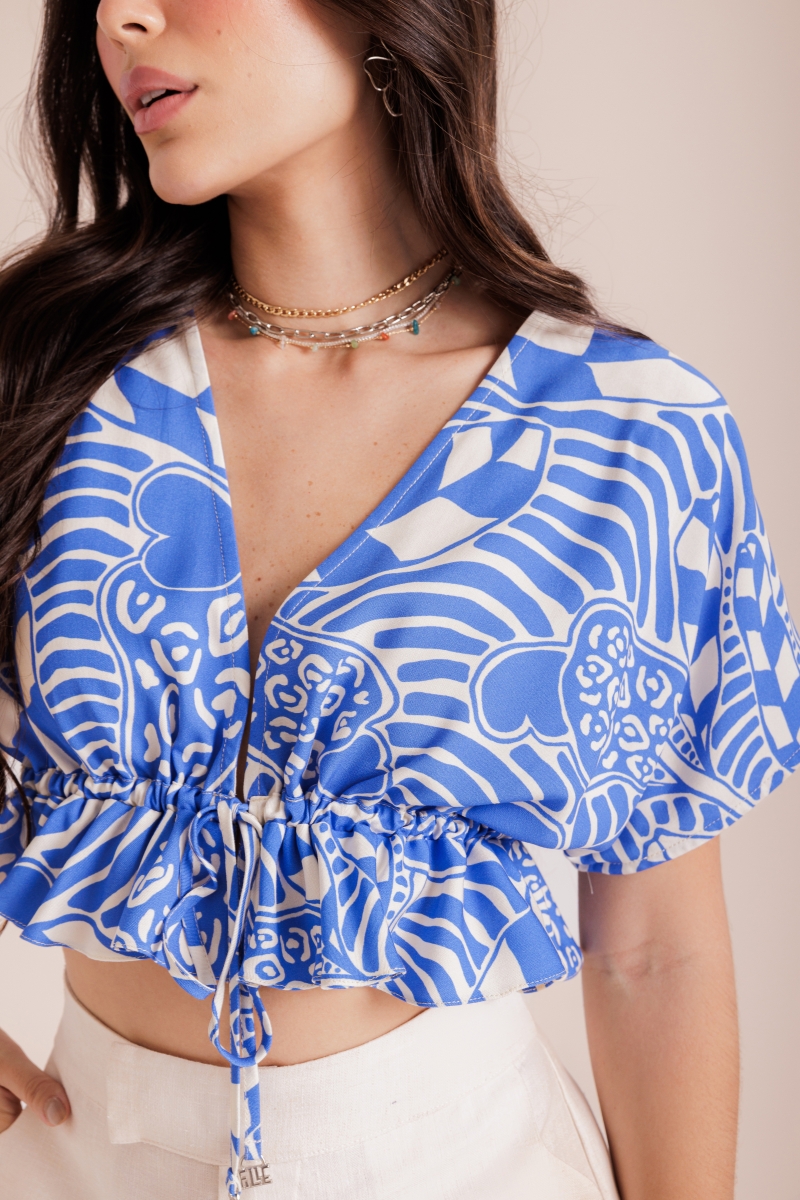 Cropped confeccionada em viscose, com uma estampa charmosa estilo azulejos que traz um toque cultural ao visual. A peça destaca-se pela amarração frontal regulável, permitindo um ajuste personalizado, e pelos delicados babados na barra, que adicionam movimento e feminilidade ao look.