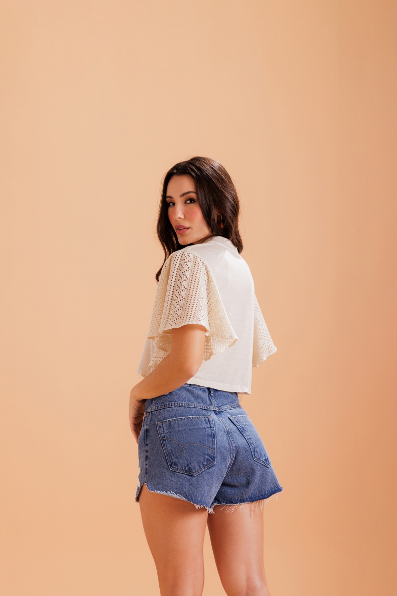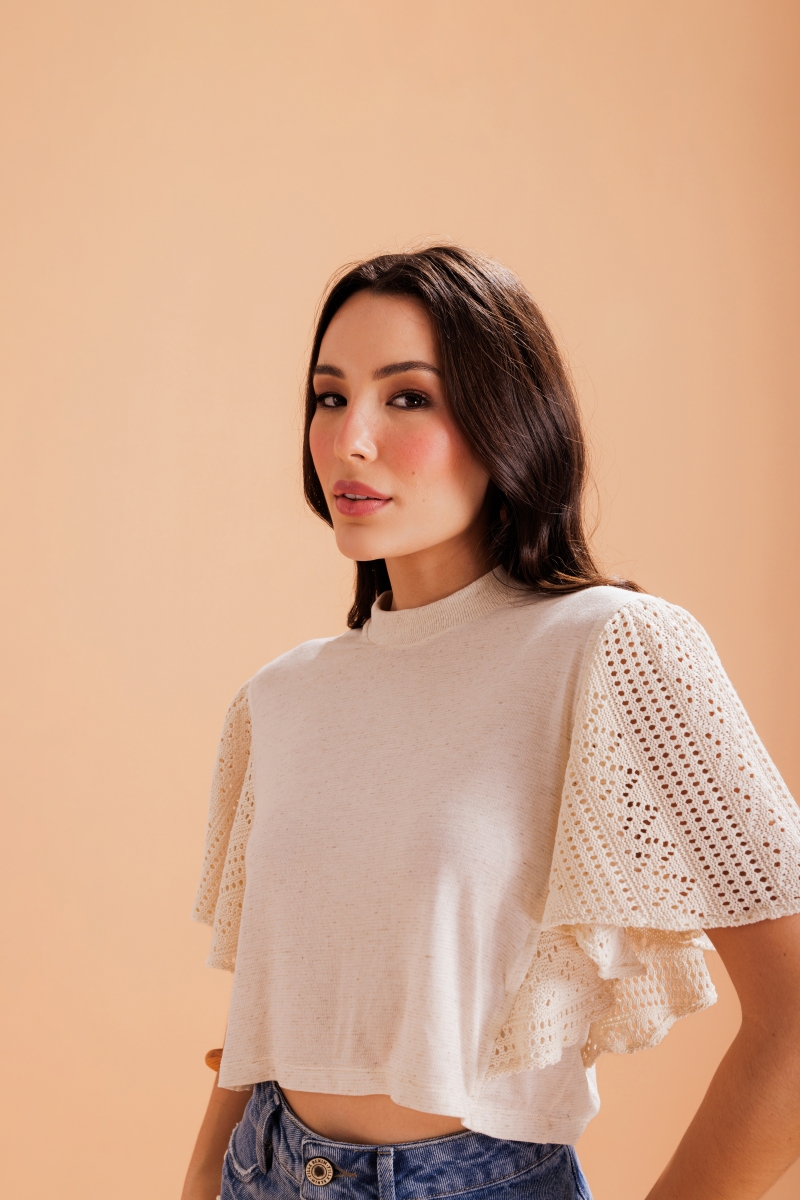 Blusa desenvolvida em tecido viscose com linho e elastano, detalhe das mangas em crochê e gola ribana.