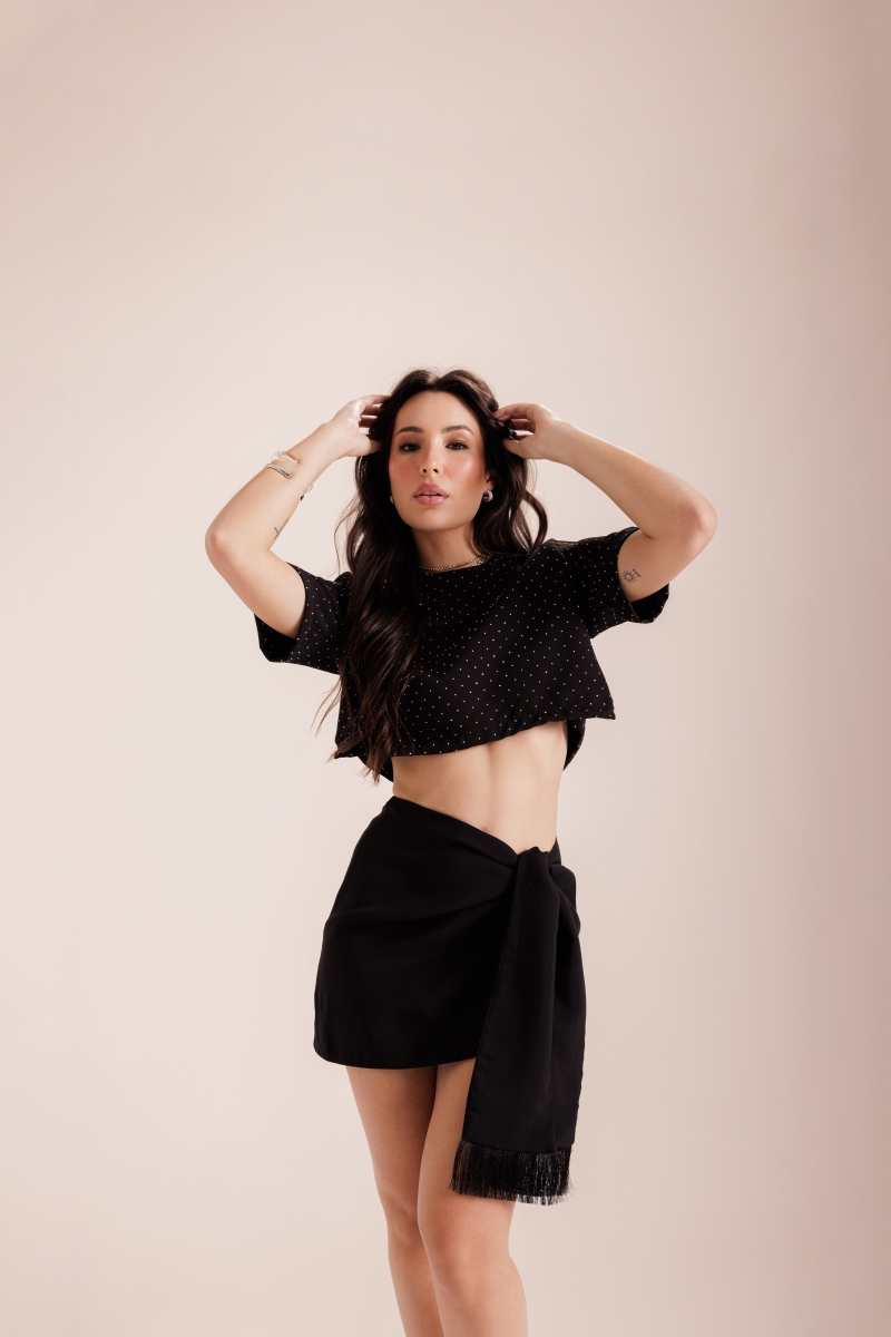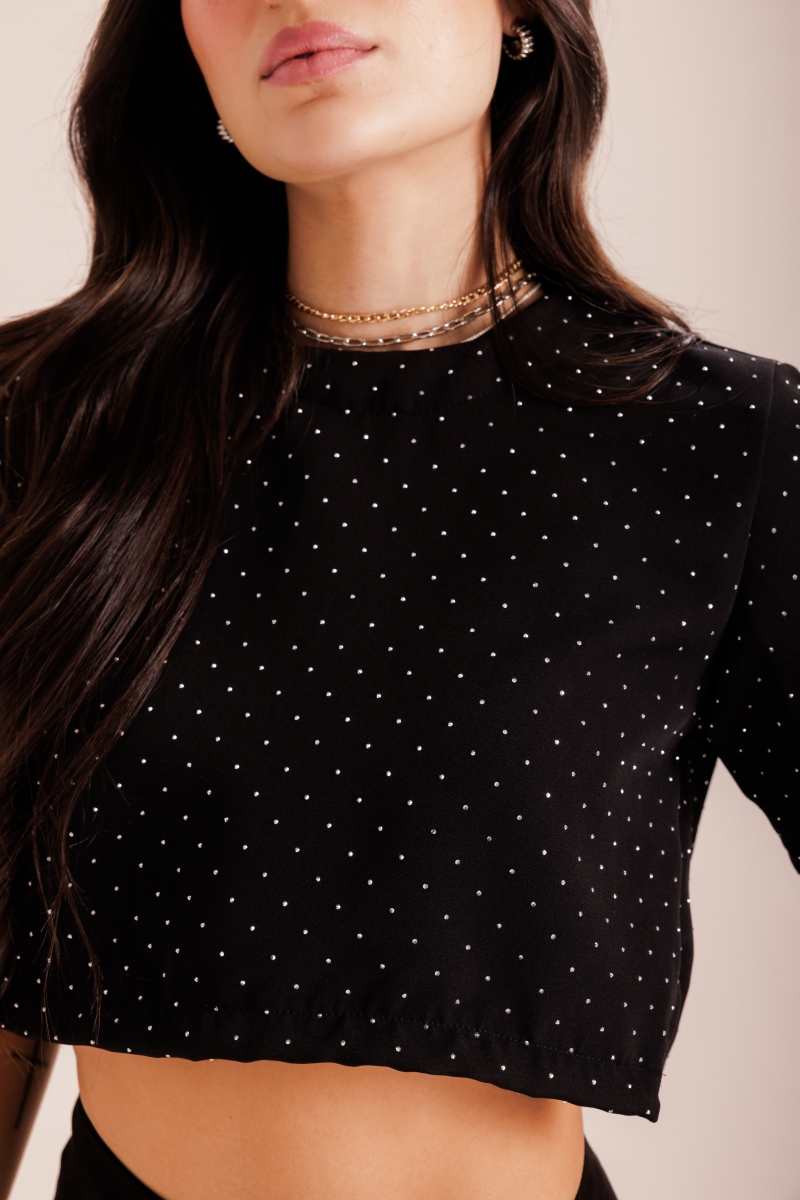 Cropped confeccionado em tecido estruturado, com aplicações de strass por toda a peça, trazendo brilho e sofisticação ao look. O corte reto e o caimento ajustado garantem uma silhueta moderna, ideal para quem busca uma peça statement para composições noturnas ou eventos especiais.
