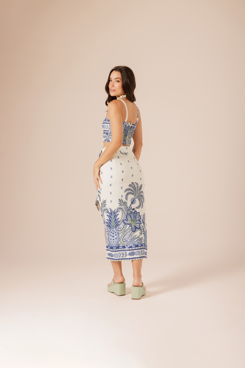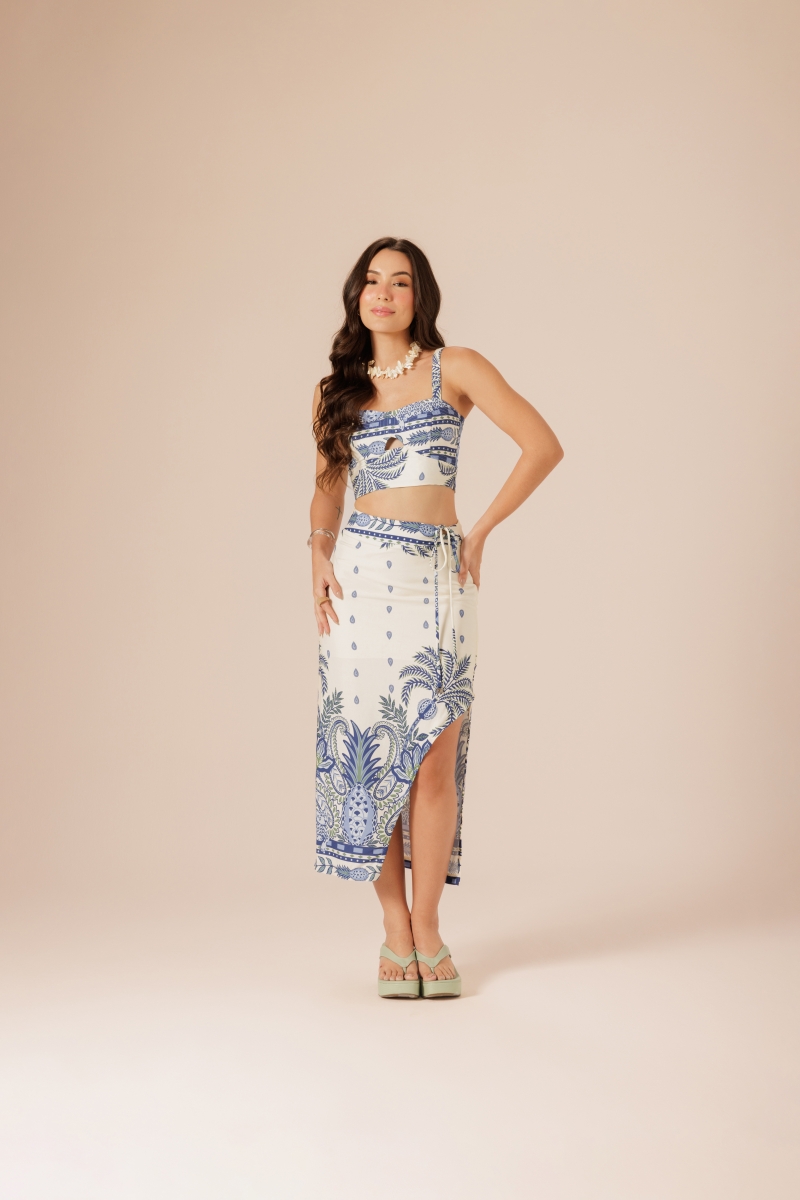 Saia midi, confeccionada em viscose, une elegância e modernidade. Sua fenda lateral adiciona um toque de sensualidade e movimento, dando destaque para sua fluidez. O detalhe de espaço vazado e a amarração no cós conferem um charme especial, permitindo um caimento perfeito.
