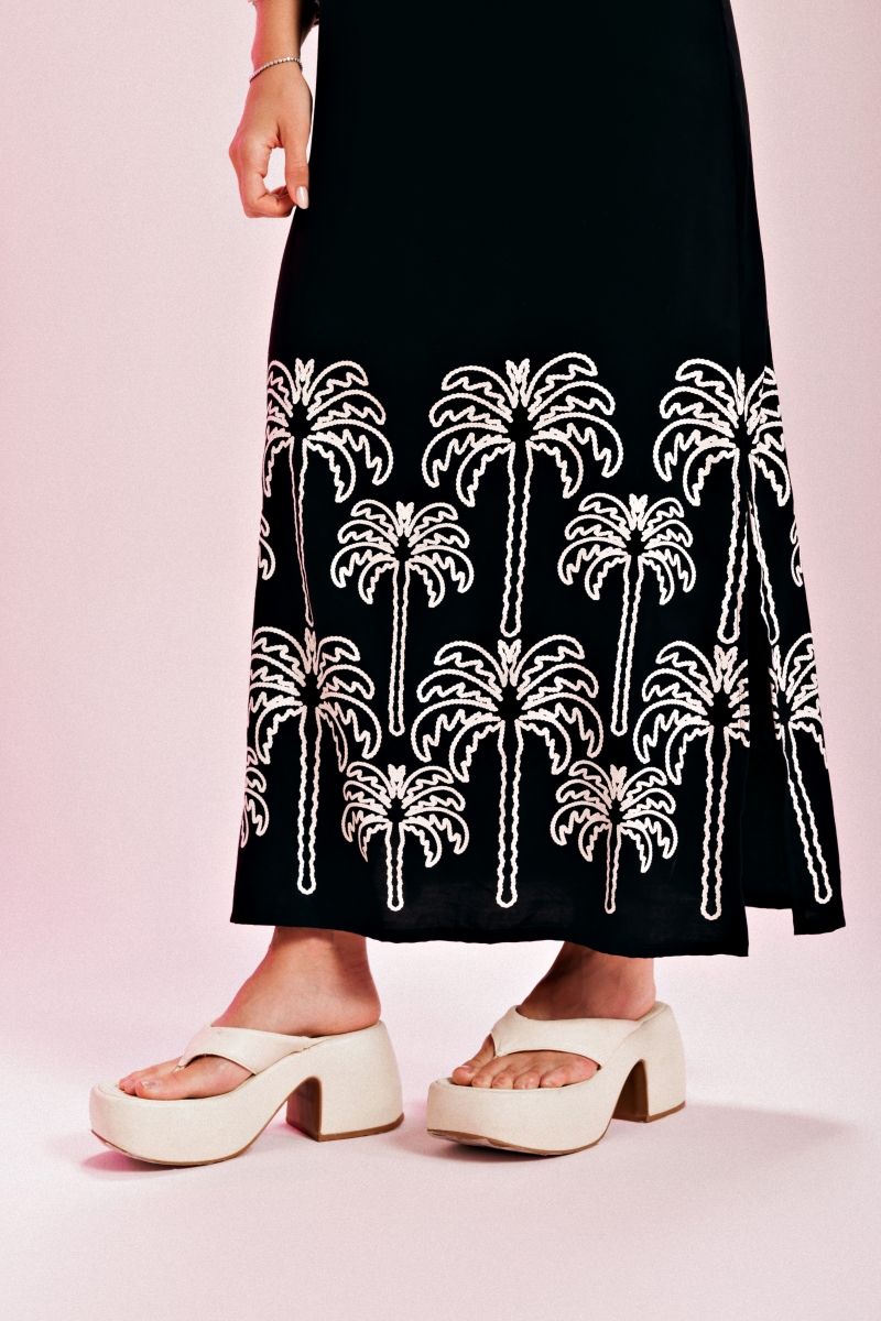 O vestido exibe um look fresco, moderno e cheio de personalidade. O estampado de coqueiros traz uma vibe tropical e descontraída, ideal para dias mais quentes ou para criar um visual de verão único. O torçal na gola adiciona um toque diferenciado, valorizando ainda mais o decote e conferindo um charme extra à peça.