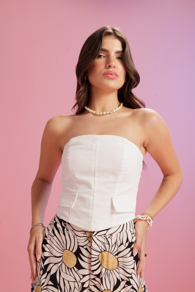 Corset confeccionado em cambraia de linho, com uma composição de algodão e linho que proporciona leveza e um toque natural ao tecido. O modelo conta com lastex e zíper nas costas, garantindo um ajuste confortável ao corpo. As lapelas laterais adicionam um charme extra, enquanto a barra assimétrica traz um detalhe moderno e autêntico à peça. Perfeito para composições cheias de personalidade.