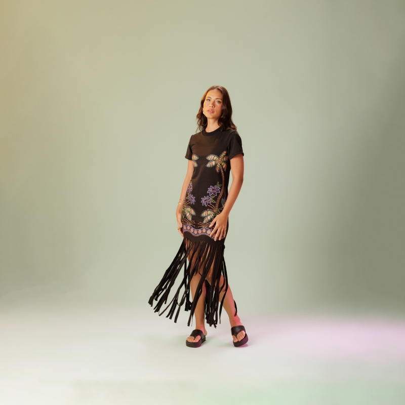 O vestido é confeccionado em ribana de algodão, oferecendo conforto e leveza ao uso. Possui silk frontal com estampas vibrantes que adicionam um toque estiloso e moderno à peça. As franjas na barra trazem movimento e um visual despojado, ideal para ocasiões casuais com um toque de personalidade.