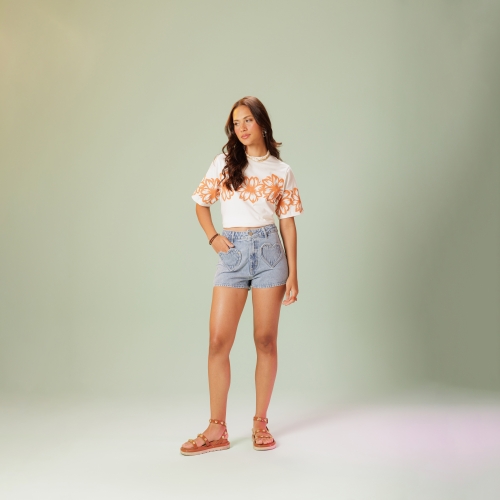 Shorts Jeans Lovewave confeccionado em algodão, com modelagem de cintura alta que valoriza a silhueta. O design apresenta bolsos frontais em formato de coração, que proporciona um toque divertido e descontraído. Ideal para compor looks casuais e frescos.