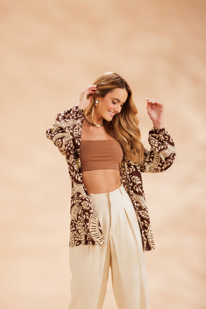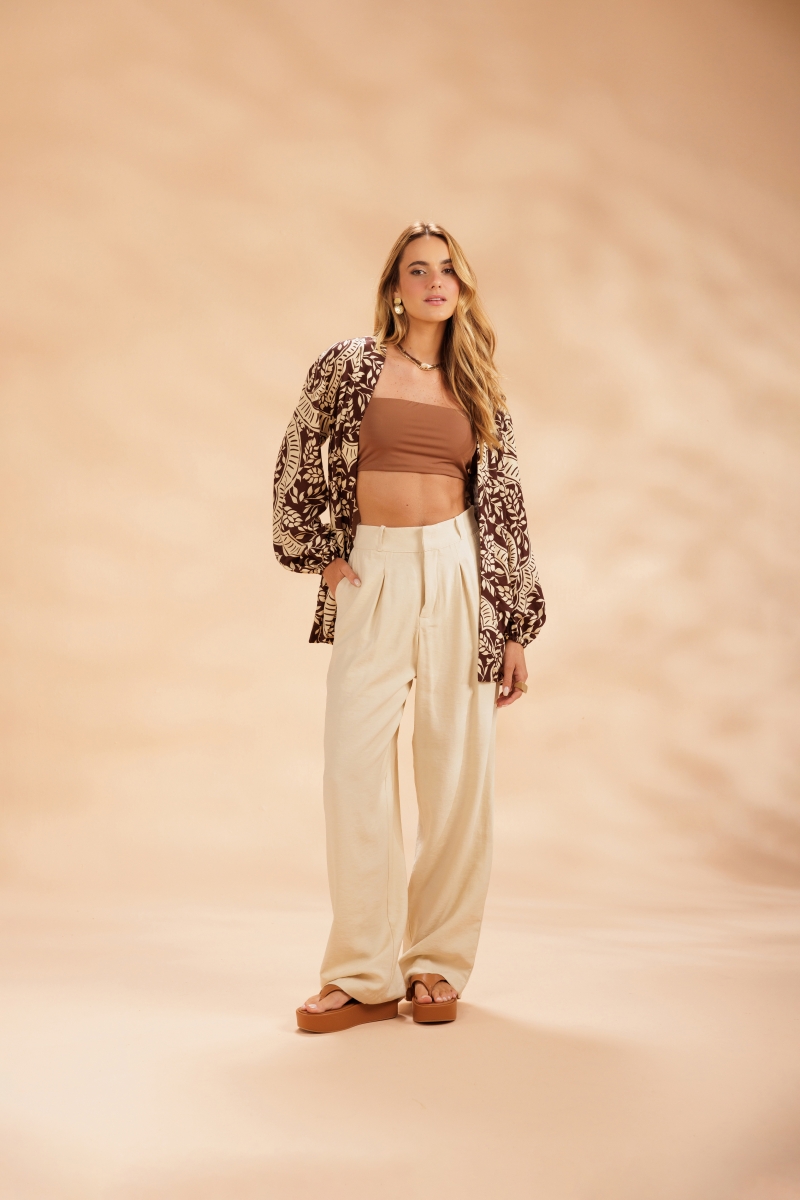 Com um caimento leve e bem estruturado, a calça de alfaiataria em viscose com poliéster apresenta modelagem ampla, pregas frontais, bolsos faca e fechamento por colchete, garantindo conforto e um toque refinado para qualquer ocasião.