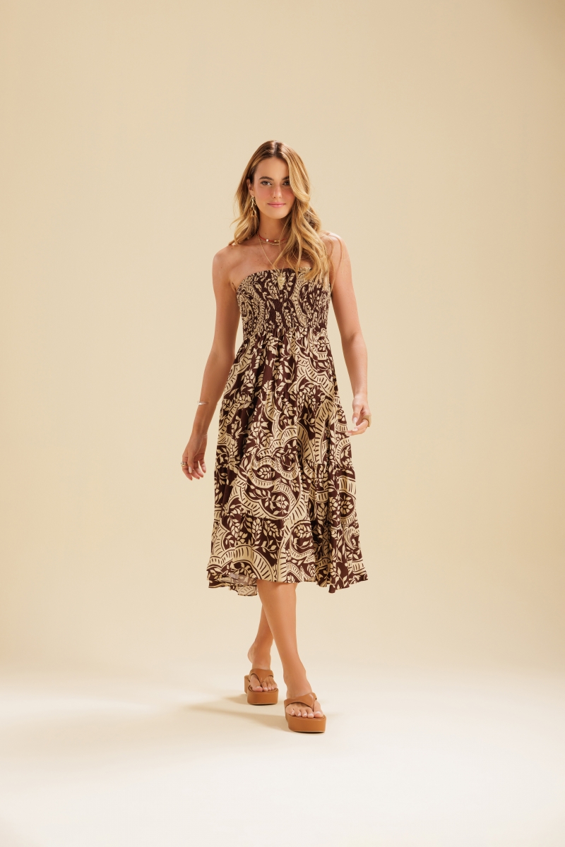 Vestido skirt estampa flor de cacau, produzido em viscose, se destaca pelo caimento leve e suave. Possui elastéx no busto/cós, criando um ajuste firme, mas sem apertar e fenda lateral. A peça versátil pode ser usada como vestido ou como saia.