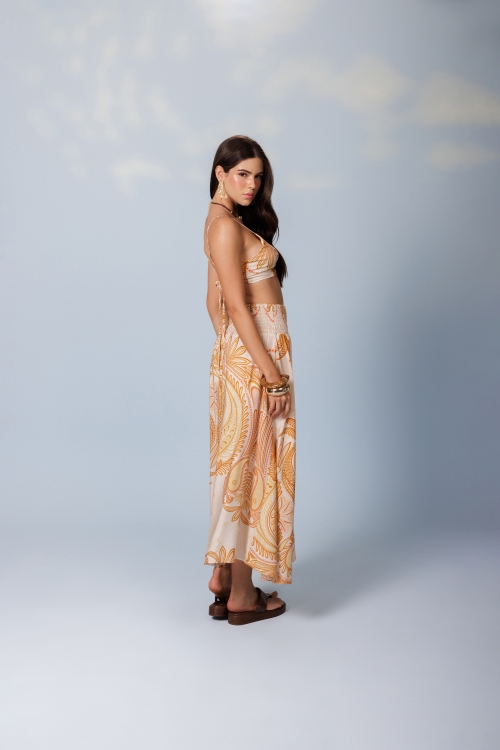 Saia Tropicália em tecido 100% viscose com estampa e caimento leve. Possui cós todo em lastex, que se ajusta bem ao corpo e garante conforto no uso. Um modelo descomplicado e cheio de movimento pro dia a dia.