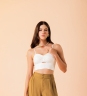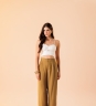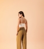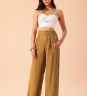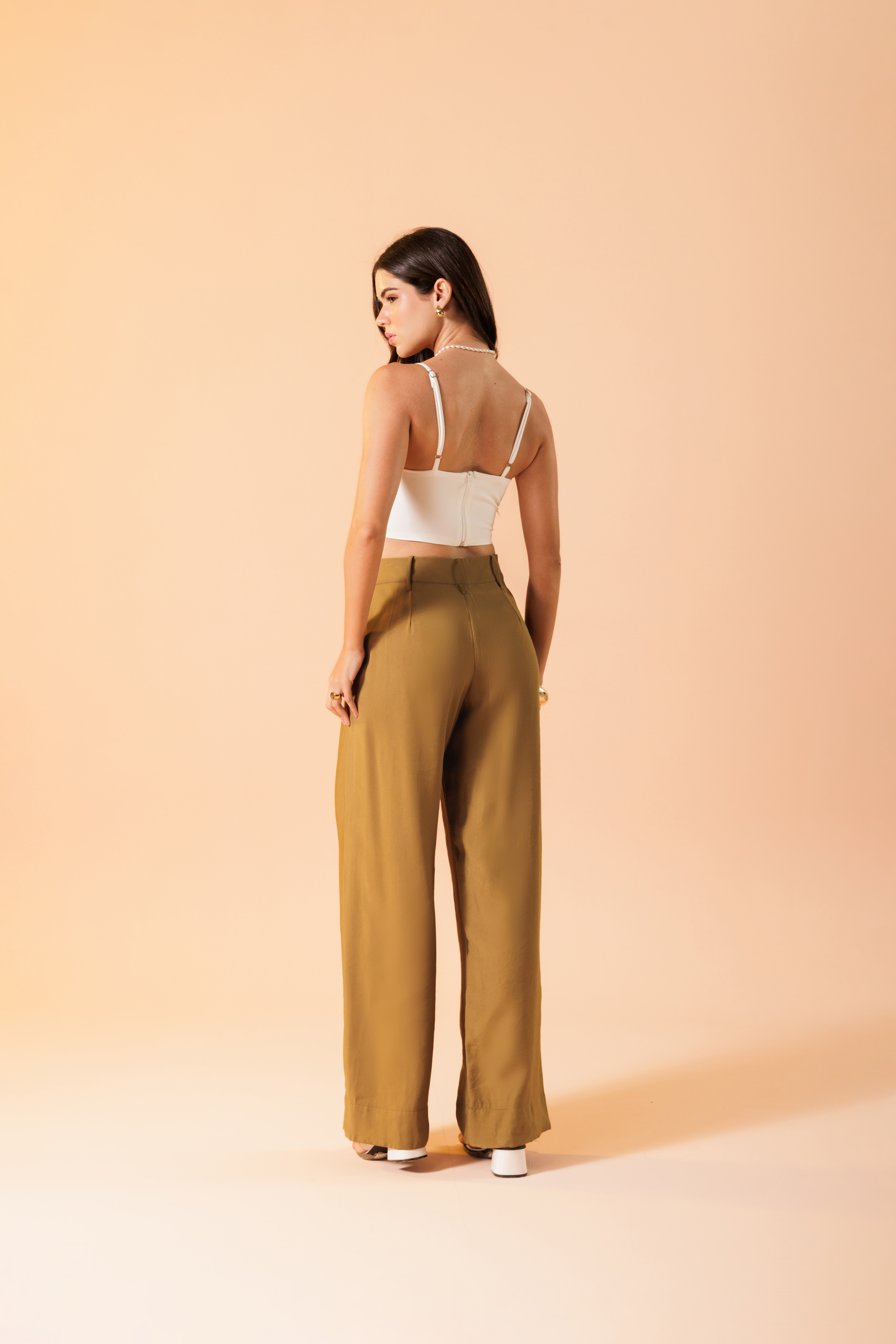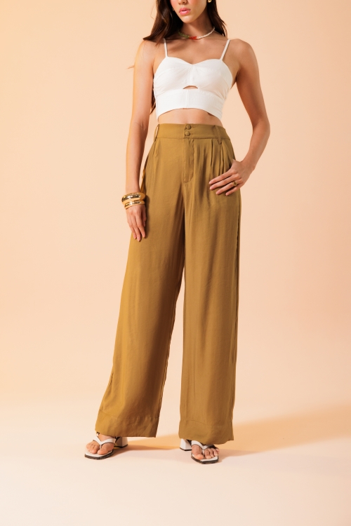 Calça Essence Oliva com caimento fluido, cintura alta, fechamento com dois botões bombê encapados e pregas frontais. Com barra larga que dá acabamento ao look.