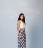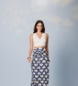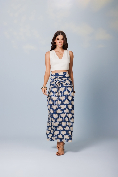 Saia Midi Raízes Tropicais em viscose com rolotê ajustável na frente e camada de tecido sobreposta criando um efeito franzido. Possui bainha lenço e fechamento com zíper invisível nas costas. Estampa gráfica marcante e caimento leve.
