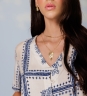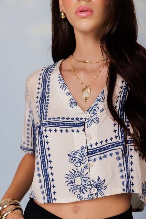 Blusa Areia e Mar em viscose com estampa azul e fundo claro. Possui botões frontais com acabamento embutido na parte inferior e mangas curtas. Modelagem soltinha com leve bico frontal.