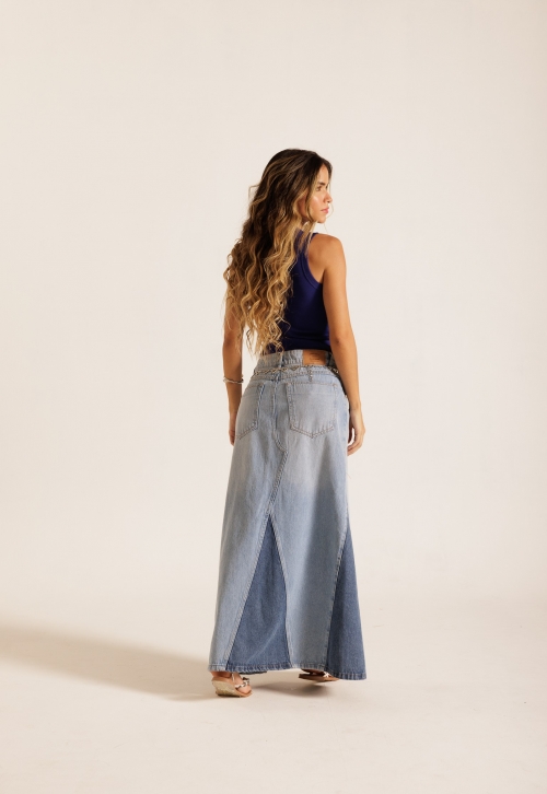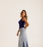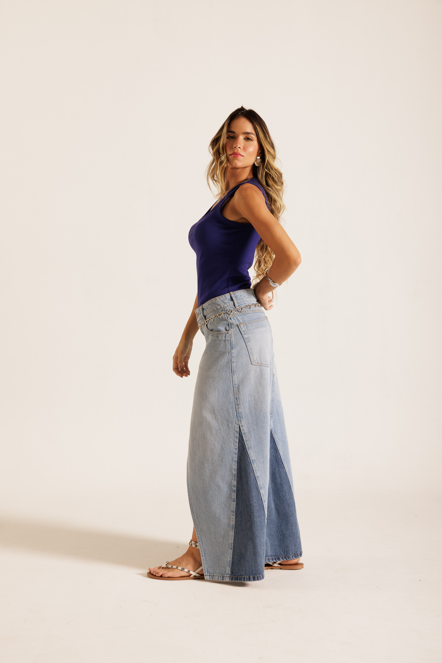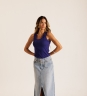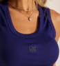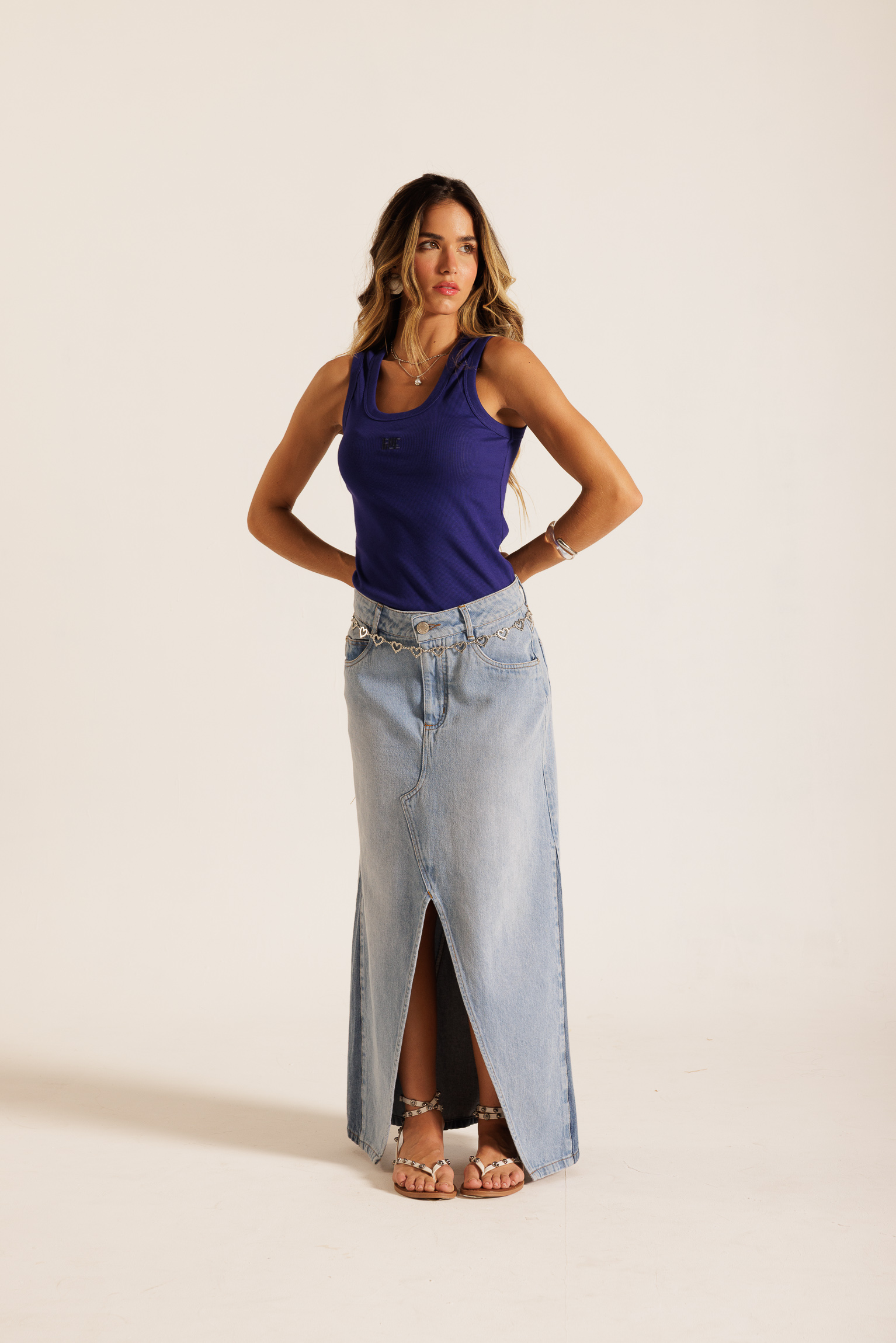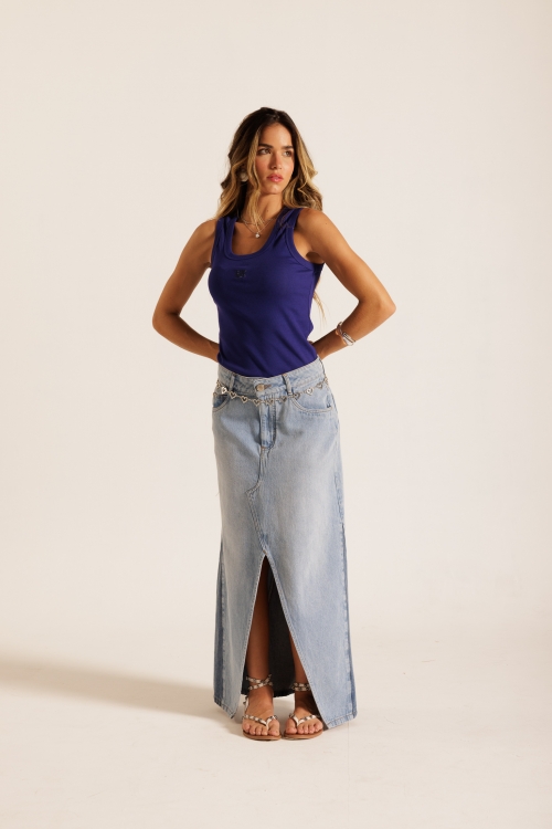 Regata Bordada Azul Bic em tecido 96% algodão e 4% elastano, com acabamento em viés e bordado discreto na frente. Modelagem ajustada ao corpo e decote arredondado.