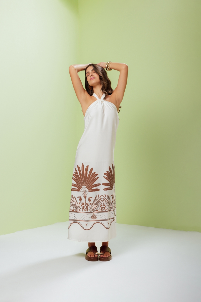 Vestido Terra Palm em tecido de toque leve, confeccionado em 90% viscose e 10% poliéster. Possui silk frontal e nas costas, alça que amarra no pescoço e modelagem reta que valoriza o caimento natural da peça.