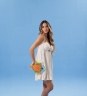 Vestido Curto Doce Natural com busto em nó central e recorte vazado logo abaixo. Possui alças finas reguláveis, cintura levemente ajustada e barra com babado suave. Confeccionado em tecido 88% viscose e 12% linho.