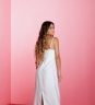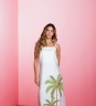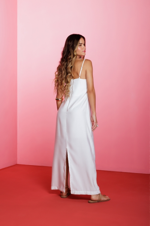 Vestido Midi Coqueiral em tecido 90% viscose e 10% poliéster, com alças finas que levam miçangas embutidas. Possui silk frontal na barra e fenda discreta nas costas, trazendo leve movimento à peça.