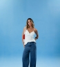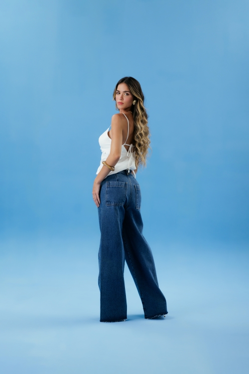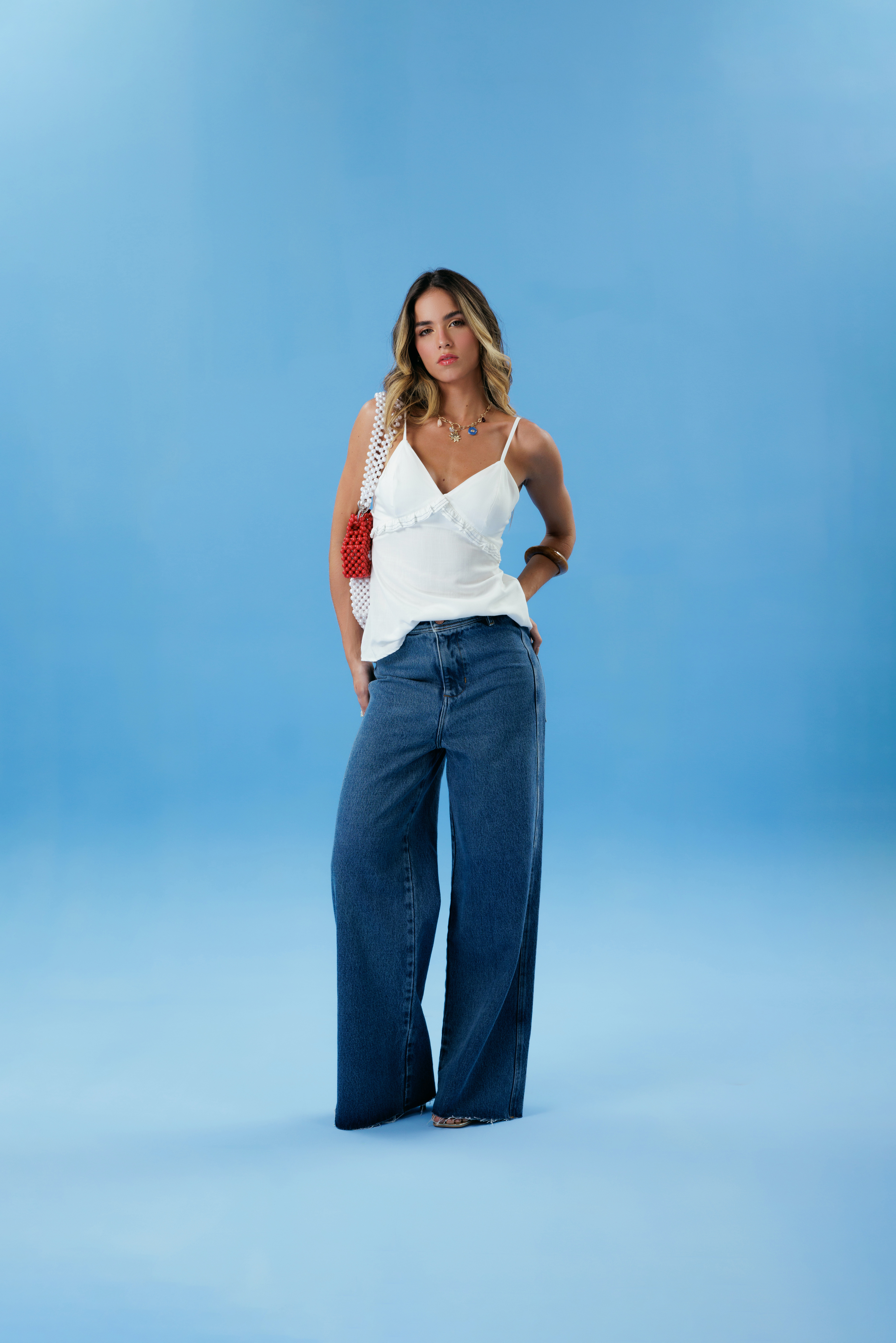 Calça Jeans Marinho em tecido 100% algodão. Modelagem reta ampla, sem bolsos frontais, com cós tradicional, passantes e fechamento por zíper e botão. O caimento solto garante movimento e a barra finaliza com acabamento simples.