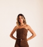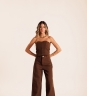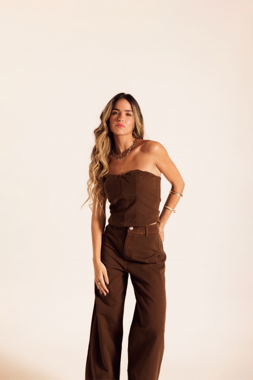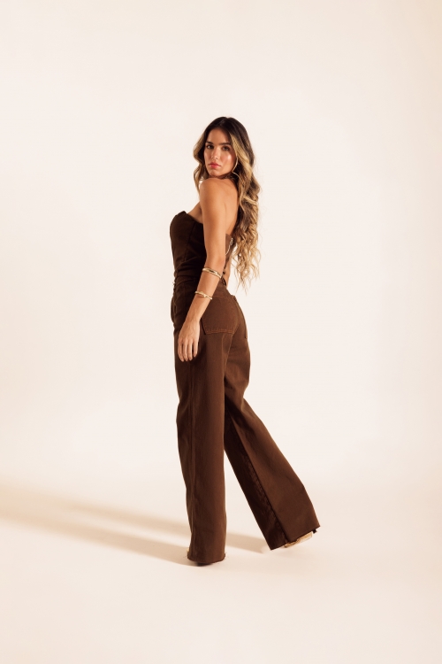Calça Jeans Amêndoa em tecido 100% algodão. Modelagem de pernas amplas, cós com passantes, fechamento por zíper e botão. Possui bolsos quadrados aplicados nas costas e barra chuleada, trazendo acabamento despojado.