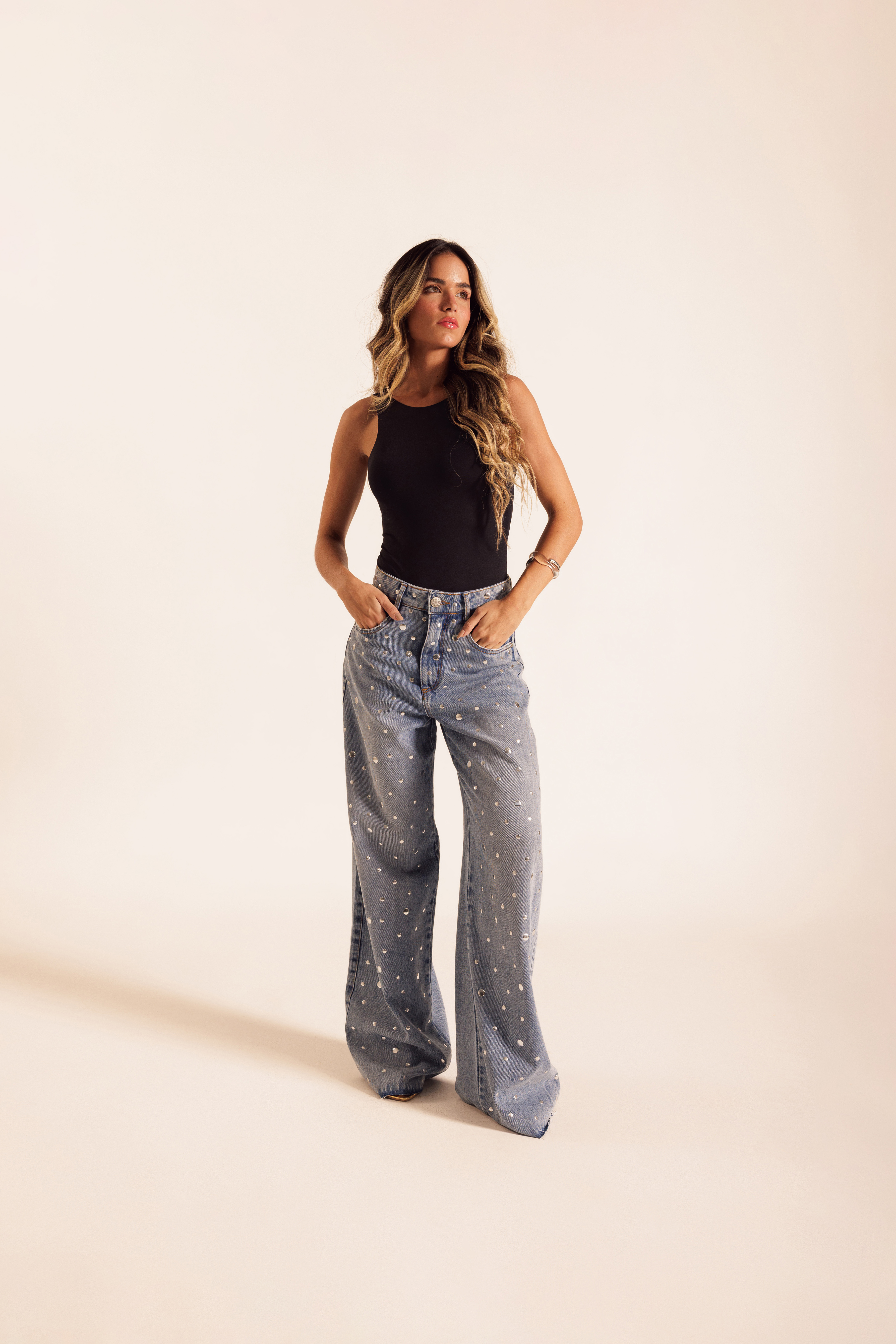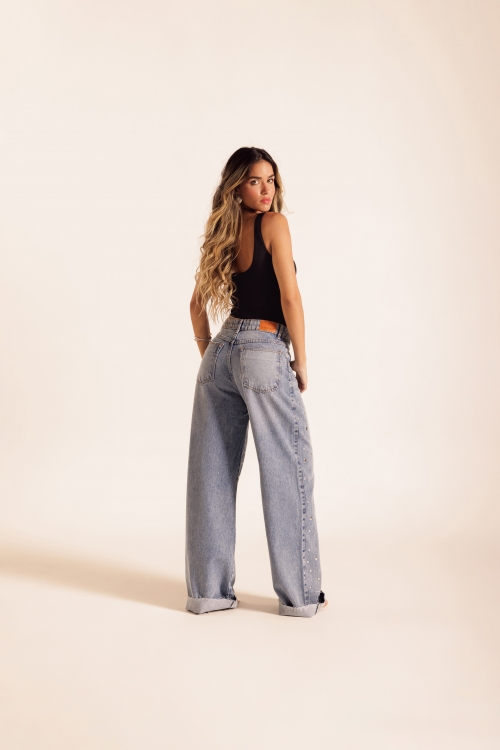 Calça Jeans Silver Shine em tecido 100% algodão, com aplicações de taxas prateadas distribuídas na parte frontal. Possui barra chuleada com detalhe levemente detonado, trazendo um toque despojado. Cós com passantes e bolsos funcionais.