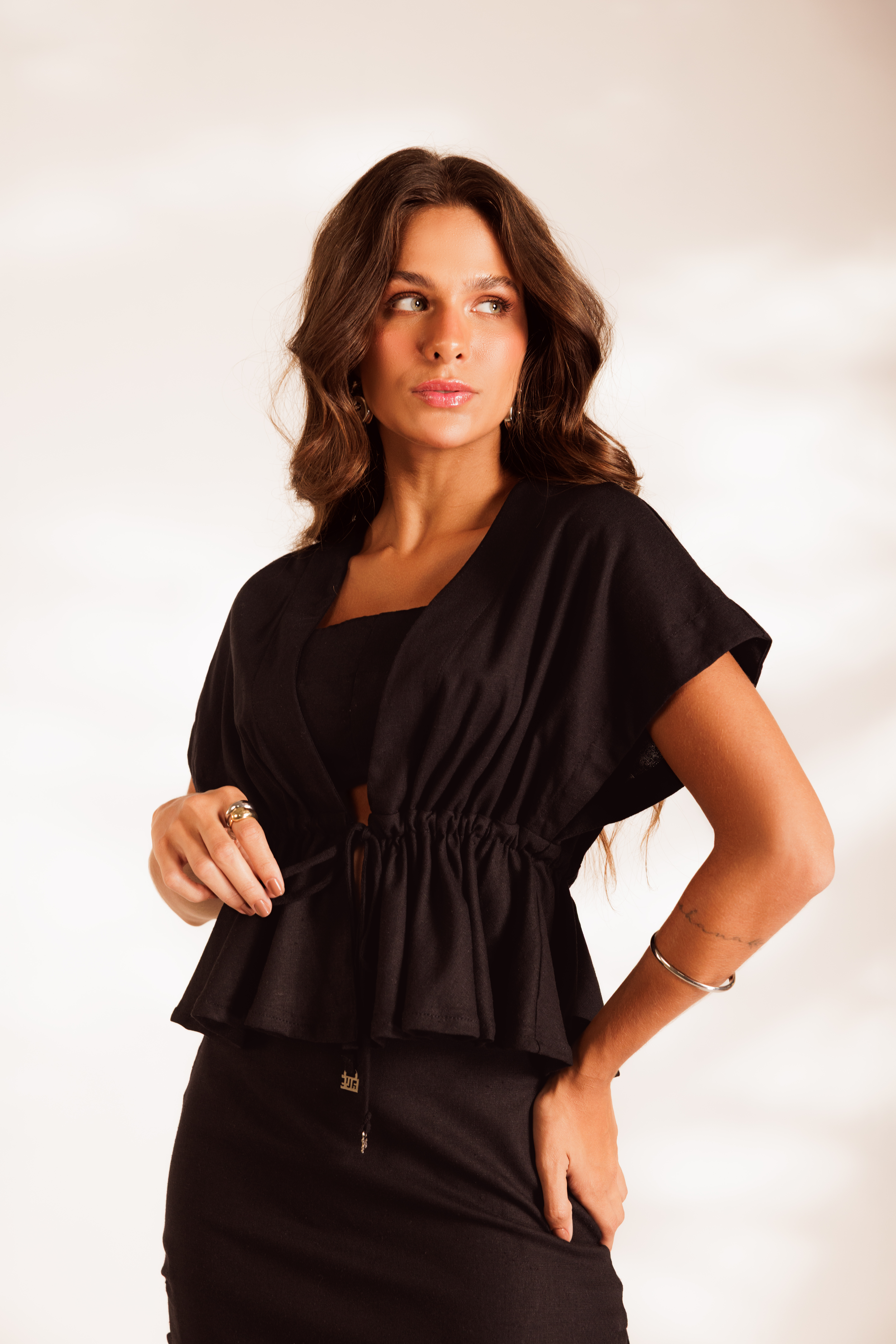 Blusa Franzida Noir com top interno, mangas amplas e ajuste frontal em rolotê que cria efeito franzido. Confeccionada em 68% viscose, 30% linho e 2% elastano, com toque natural e caimento moderno.