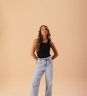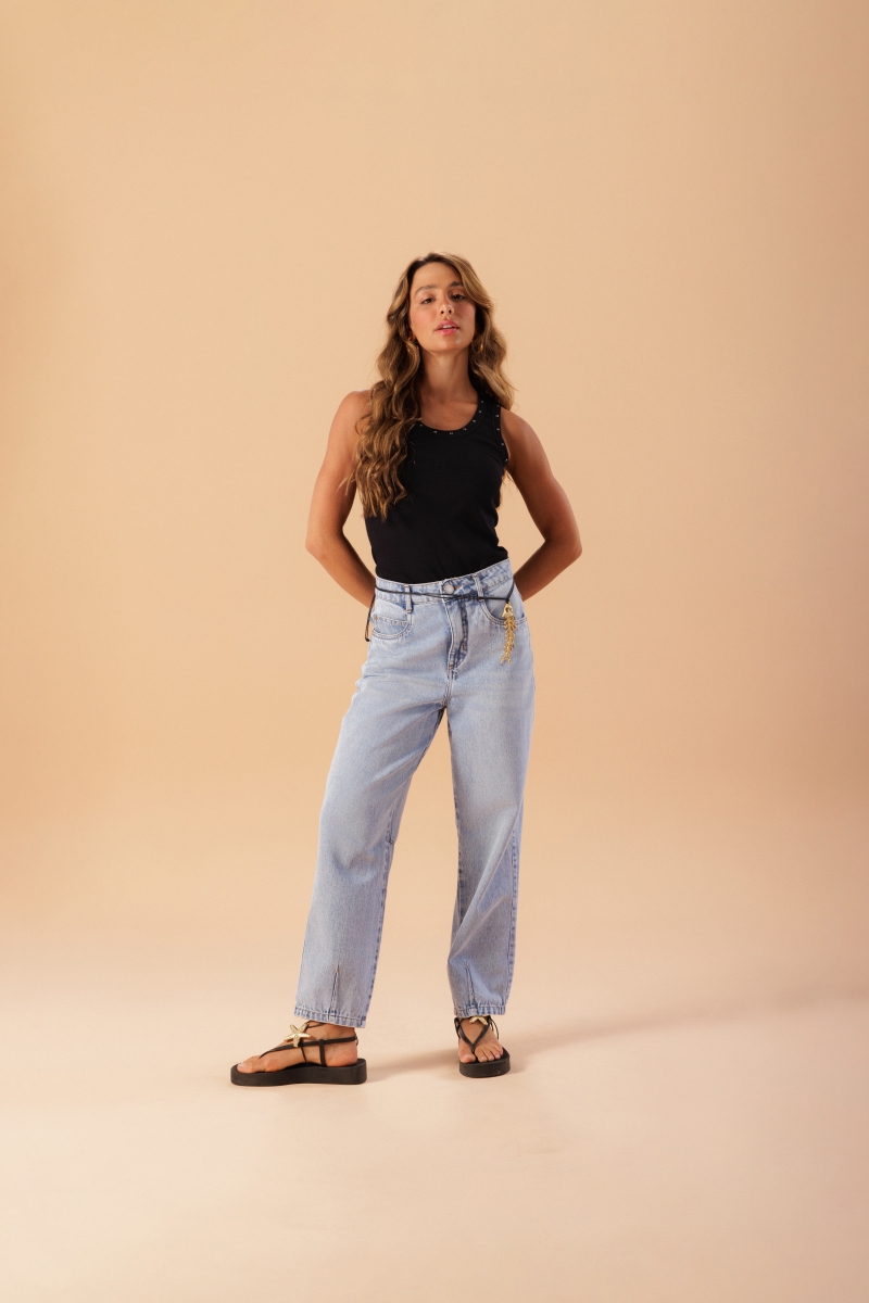 Regata Black Shine, canelada em tecido 96% algodão e 4% elastano, com toque macio e ajuste confortável ao corpo. As aplicações ao redor do decote trazem um detalhe discreto que valoriza o visual do dia a dia.