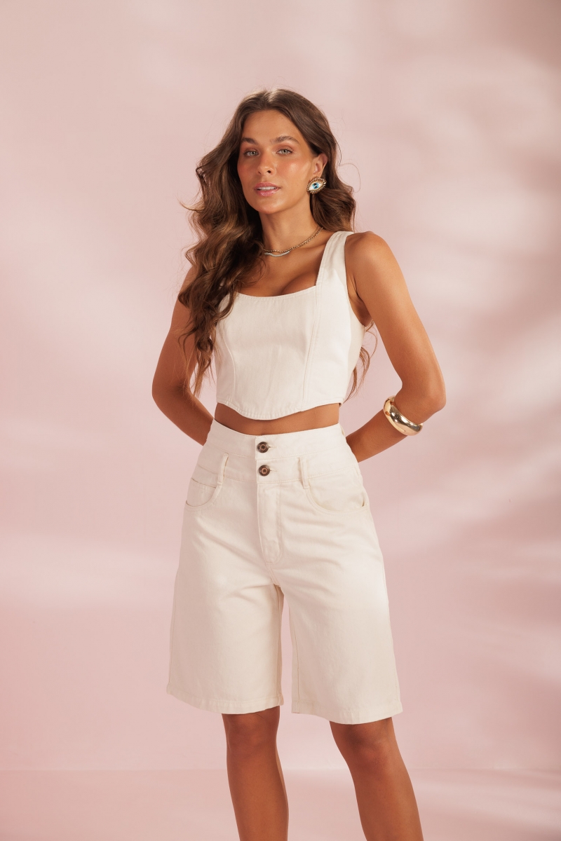 Corset Jeans Pérola com recortes estruturados, acabamento amaciado, elástico lateral e fechamento por zíper nas costas. Confeccionado em 100% algodão.
