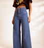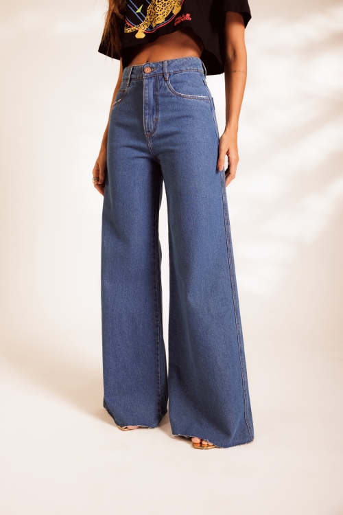 Calça Jeans Pantalona Gio de cintura alta, com pernas amplas e caimento reto. Confeccionada em 100% algodão, em lavagem azul clássica.