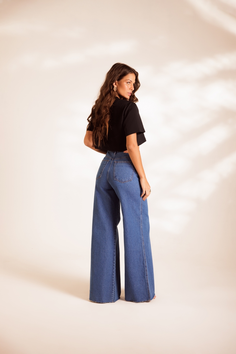Calça Jeans Pantalona Gio de cintura alta, com pernas amplas e caimento reto. Confeccionada em 100% algodão, em lavagem azul clássica.