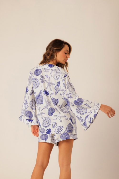 Kimono Shell de mangas soltas com top na mesma estampa, trazendo um duo moderno para dias descontraídos. Peças em tecido 100% viscose.
