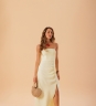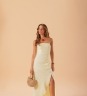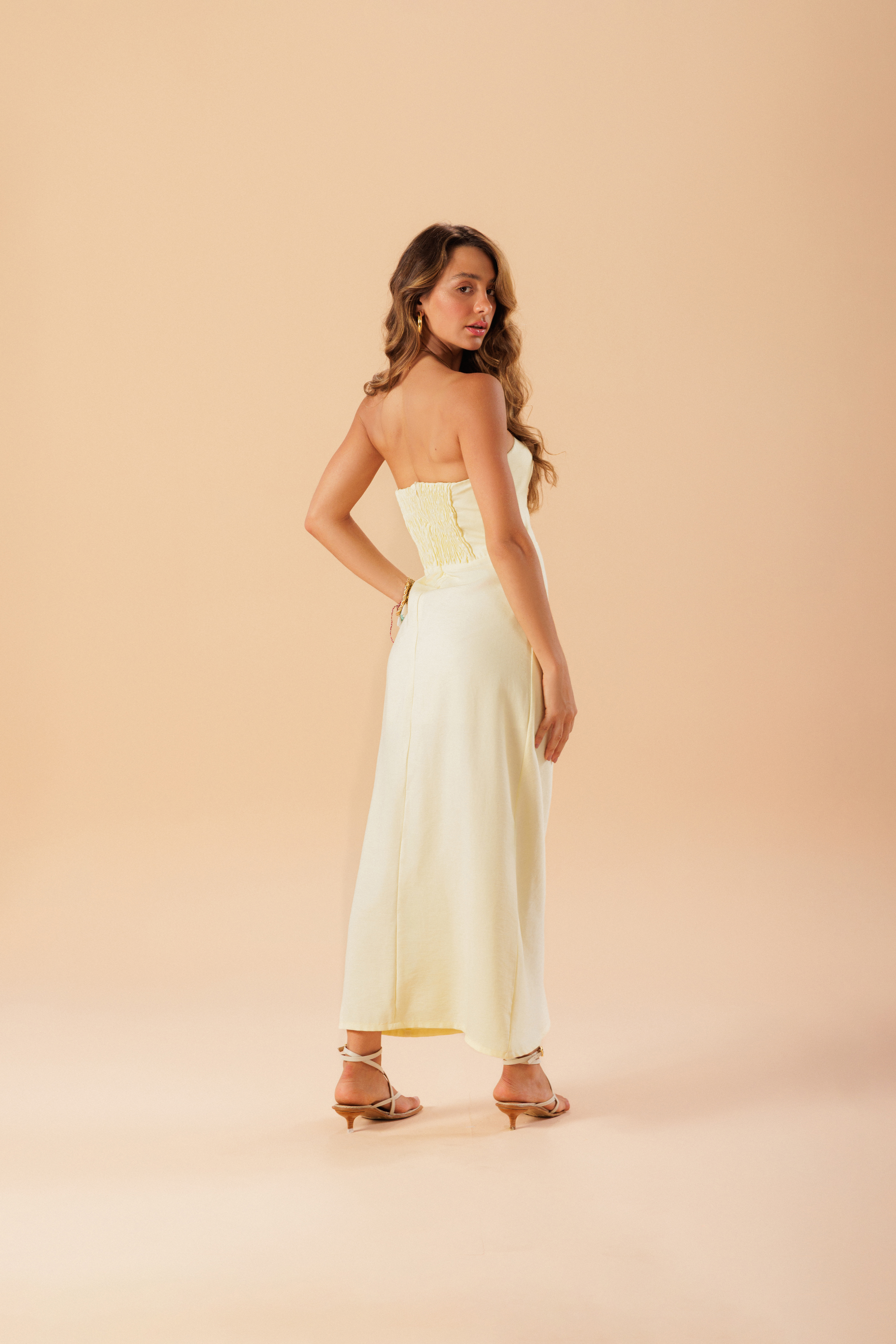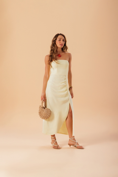 Vestido midi long tropical sem alças, possui uma fenda frontal e drapeado que destaca o caimento. Confeccionando em tecido 90% viscose e 10% poliéster.