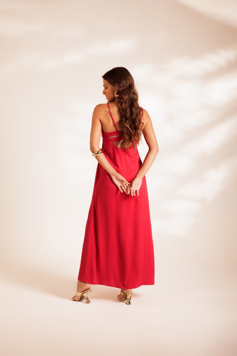 Vestido longo em viscose com caimento leve, decote ajustado e recorte abaixo do busto que valoriza a silhueta de um jeito natural. A fenda frontal traz movimento e deixa o look mais descontraído para os dias de calor. Tecido: 100% viscose.