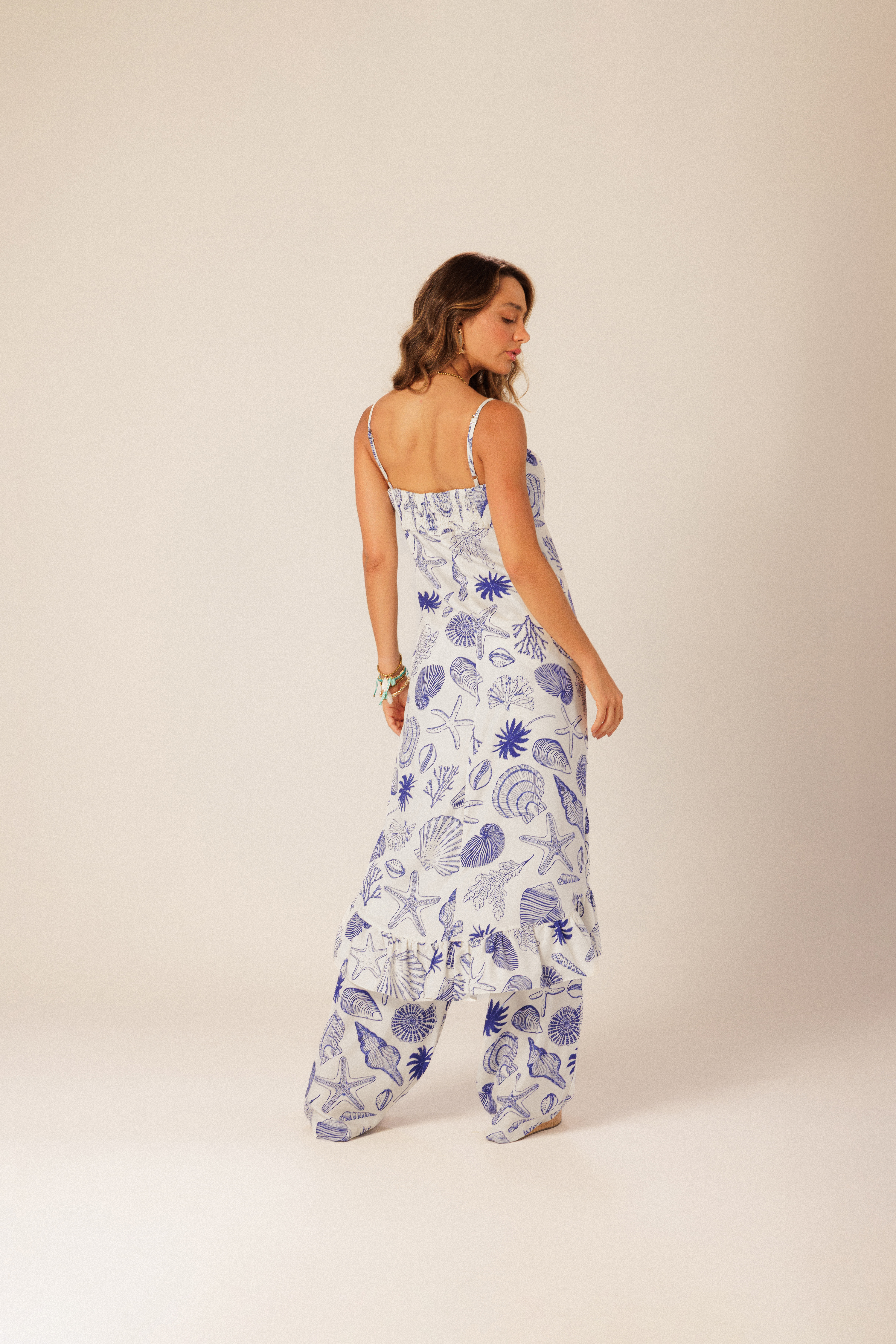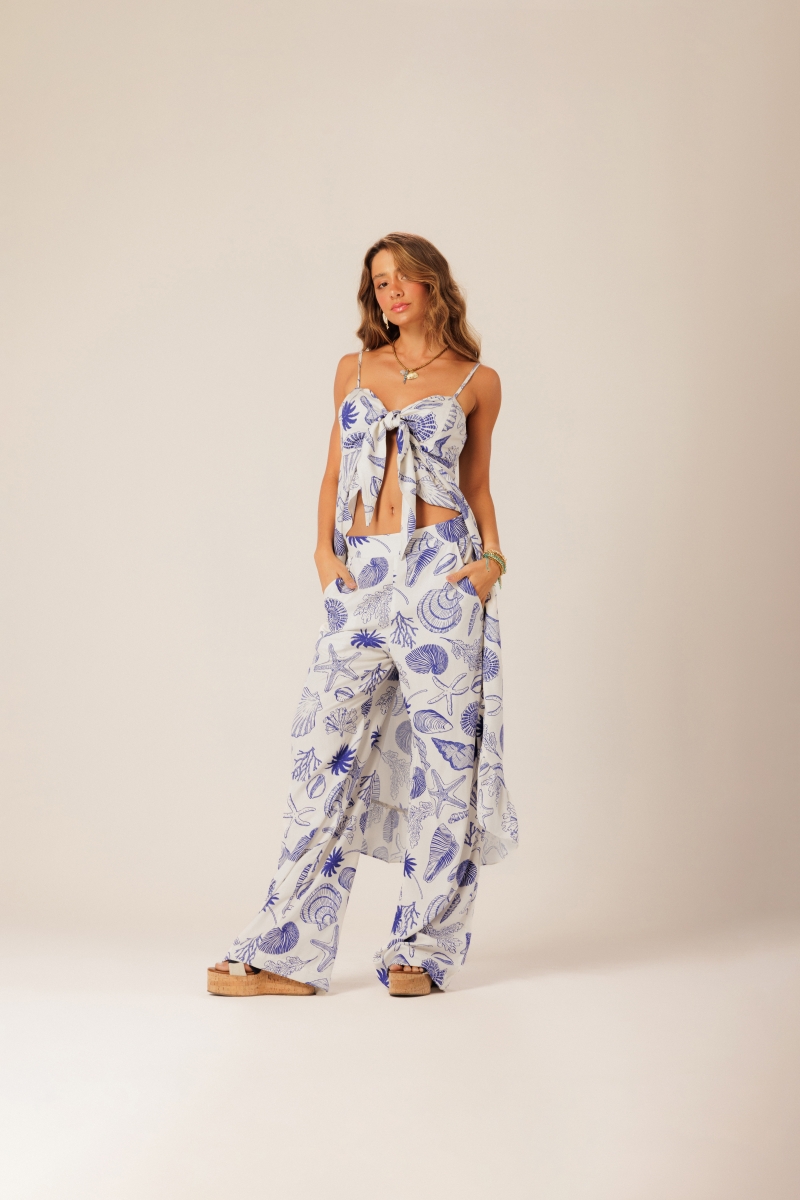 Calça Shell, com estampa exclusiva, recortes laterais e fluidez que acompanha o movimento, trazendo leveza ao look. O toque é macio e fresco, perfeita para dias quentes e produções versáteis. Tecido: 100% Viscose.