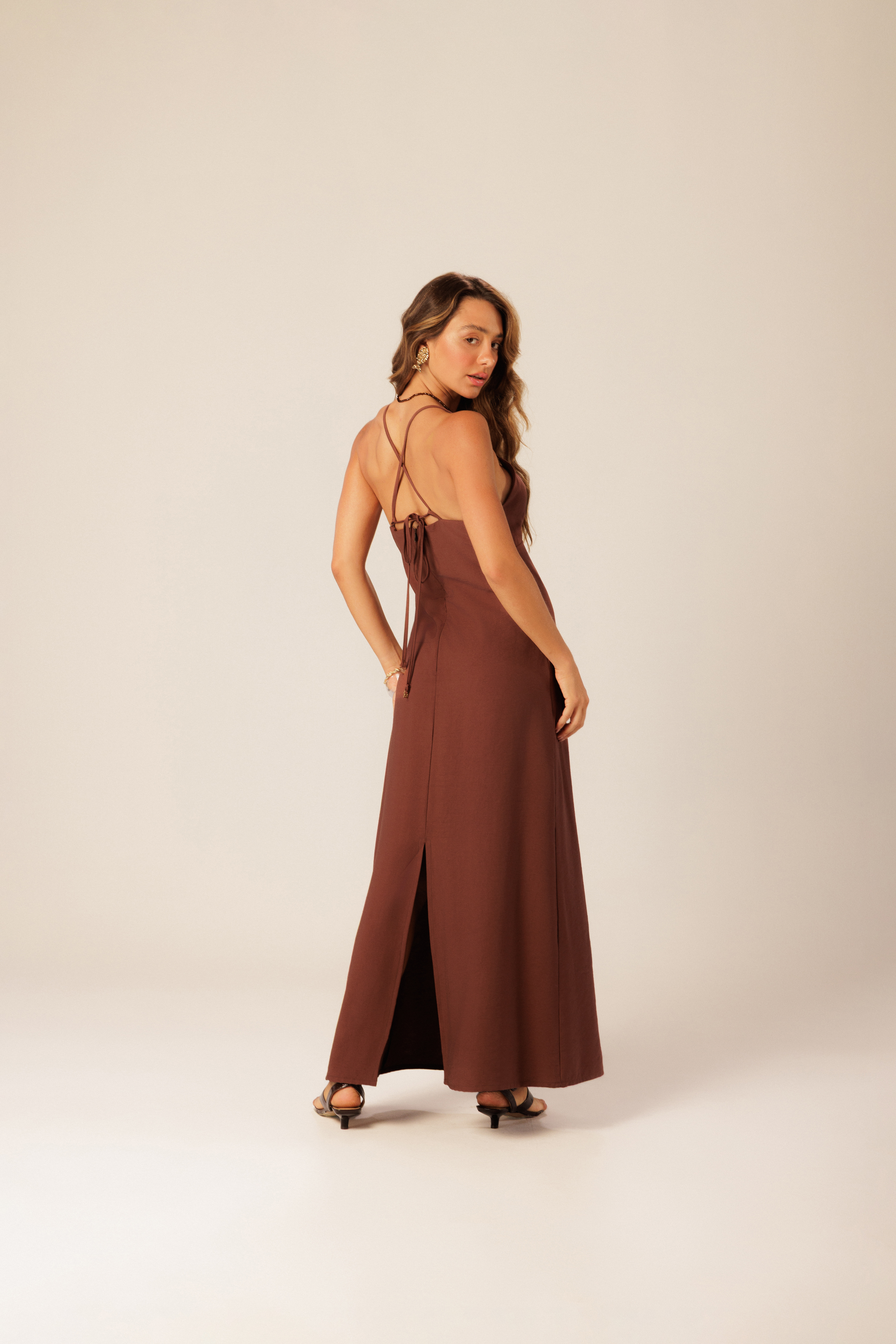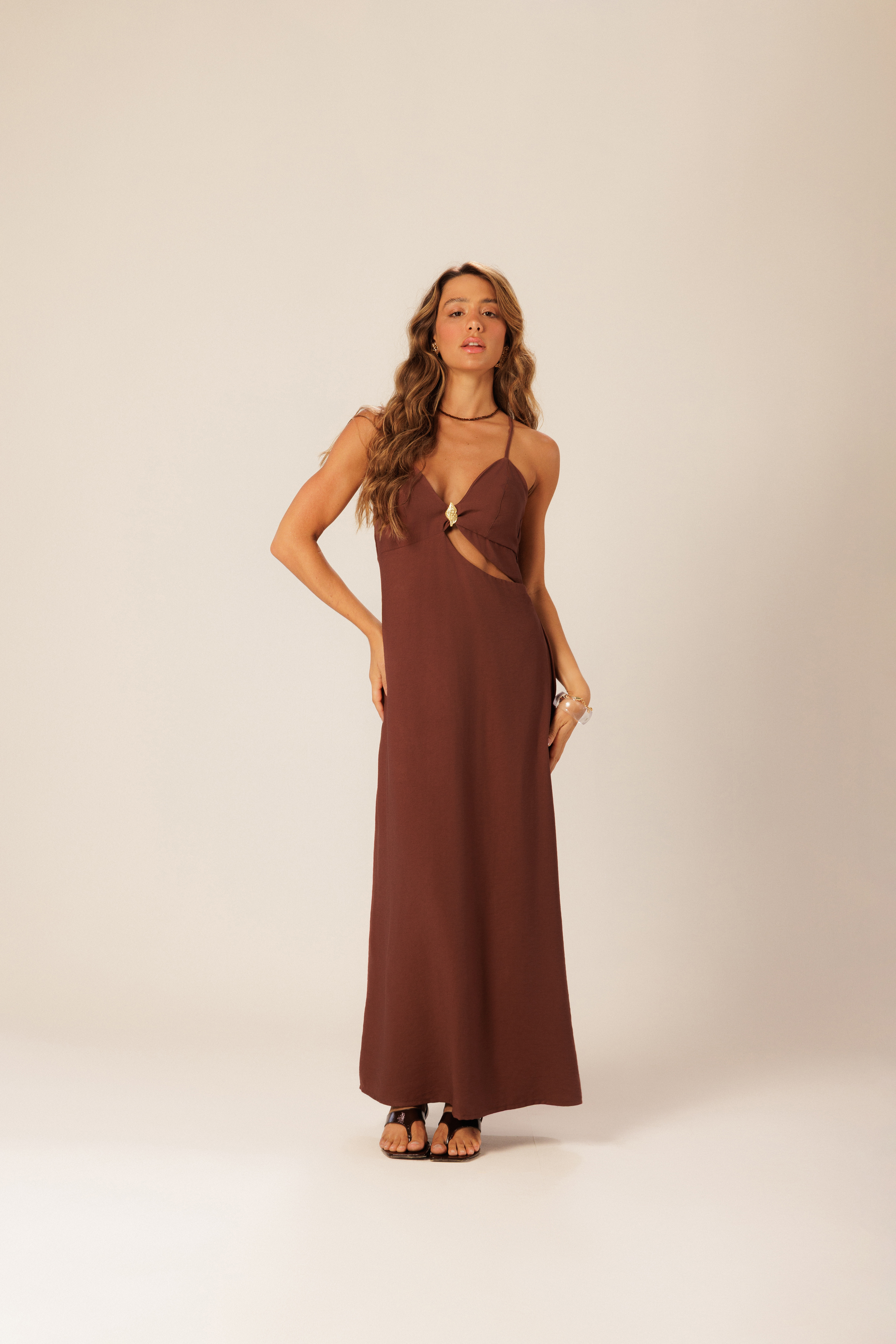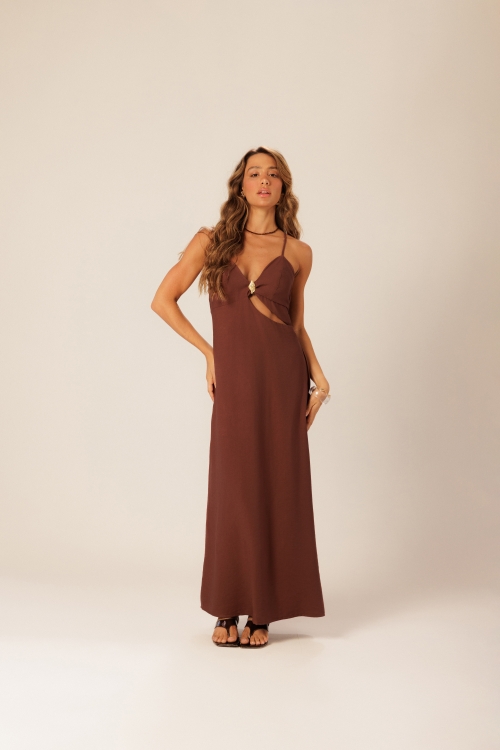 Vestido Long Tropical com alças finas, recorte lateral e detalhe com aviamento de metal que destaca o busto. Tecido 92% viscose e 8% poliéster, com caimento leve e confortável.