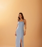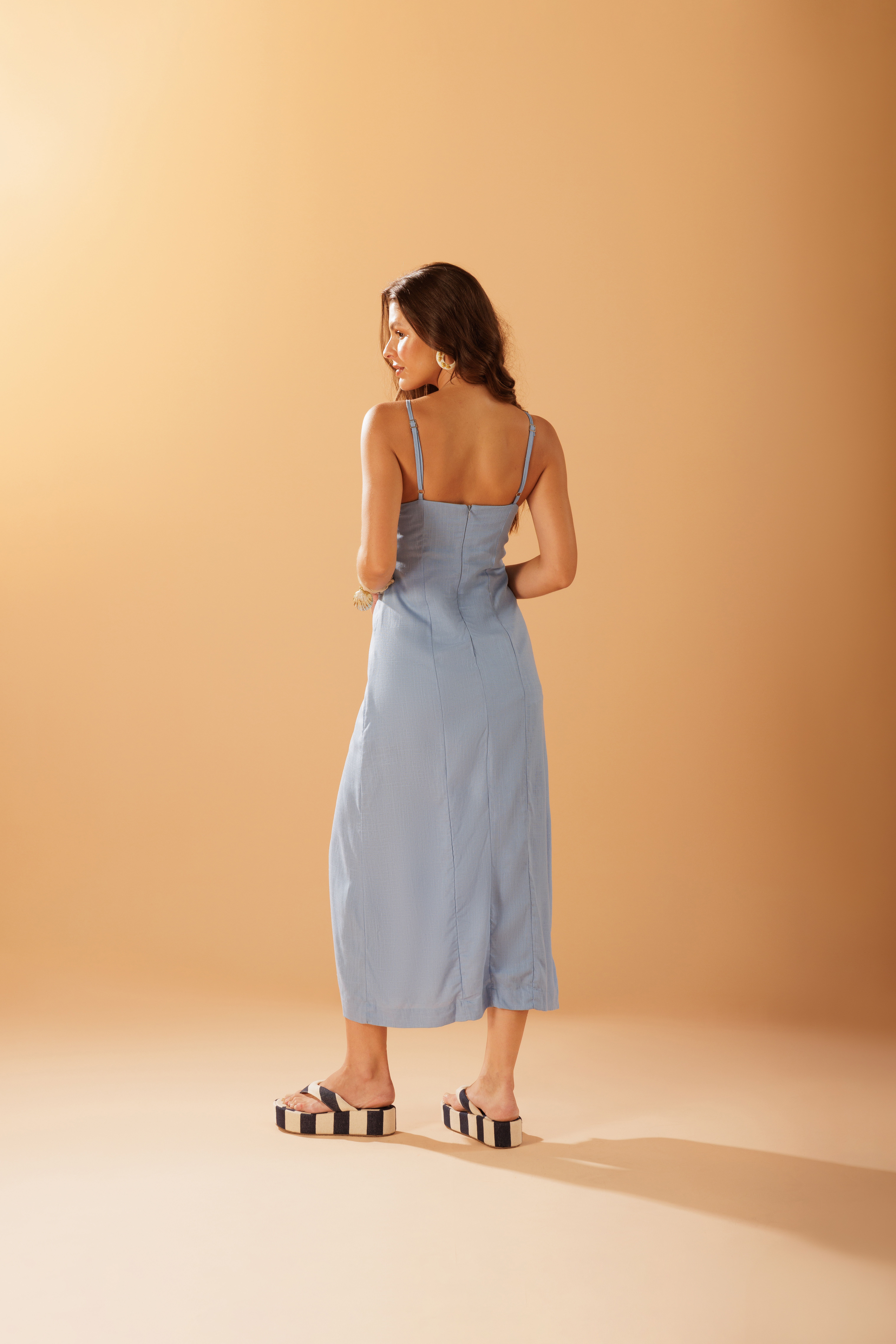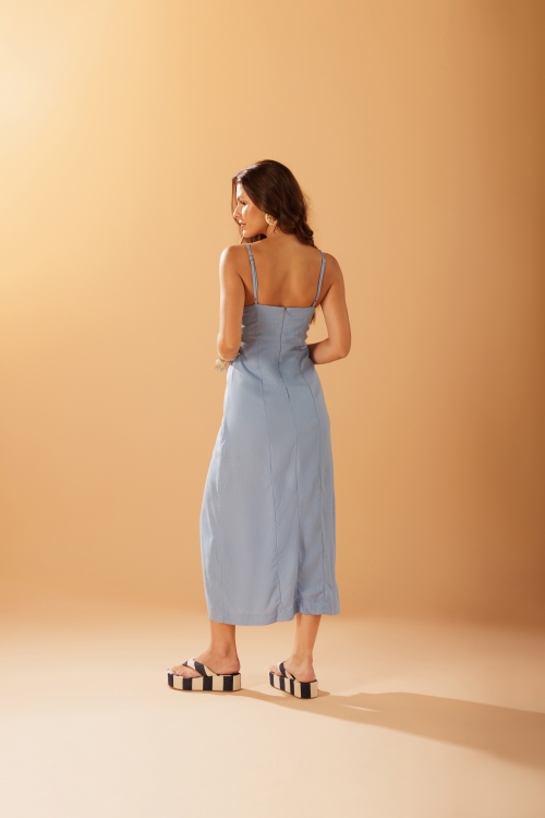 Vestido Miçanga Sky em tecido 70% viscose e 30% linho, com recortes que acompanham o corpo e fenda frontal que facilita o movimento. As alças trazem miçangas embutidas, adicionando um detalhe delicado à peça.