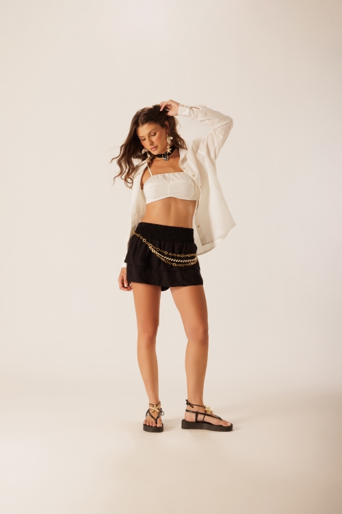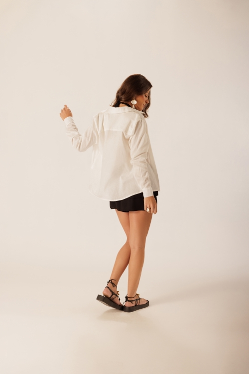 Camisa Linen Off Delírio em tecido 70% algodão e 30% linho, com toque leve e caimento natural. As pregas no punho adicionam um detalhe sutil ao acabamento da peça.