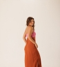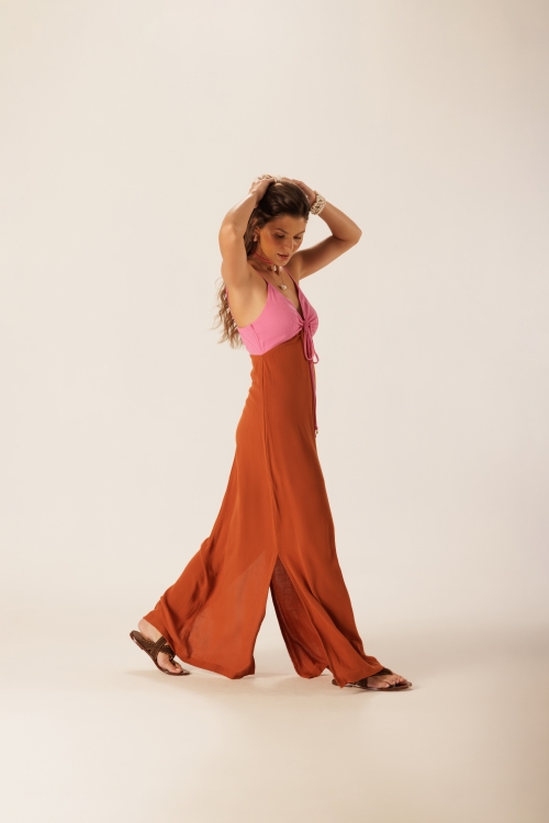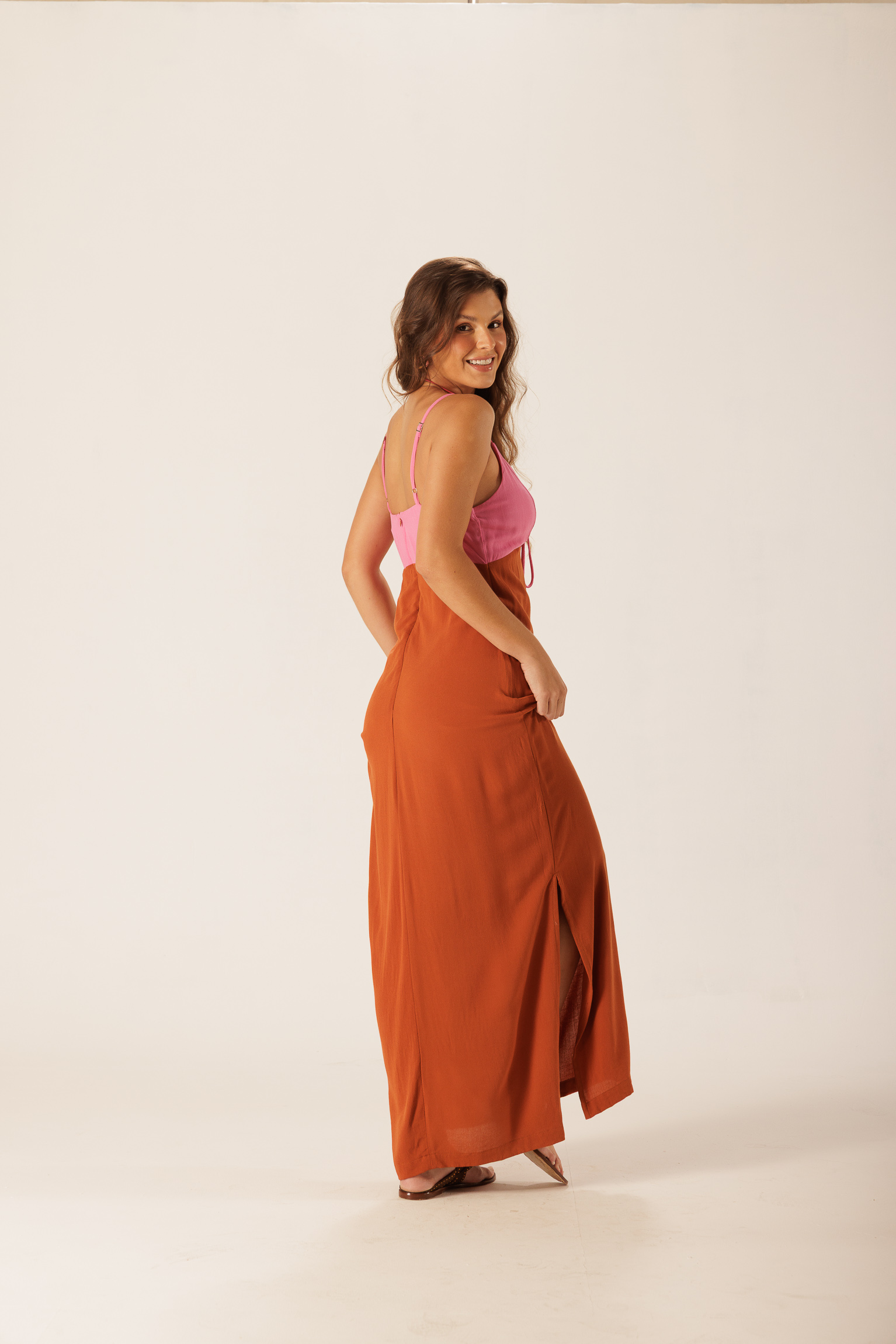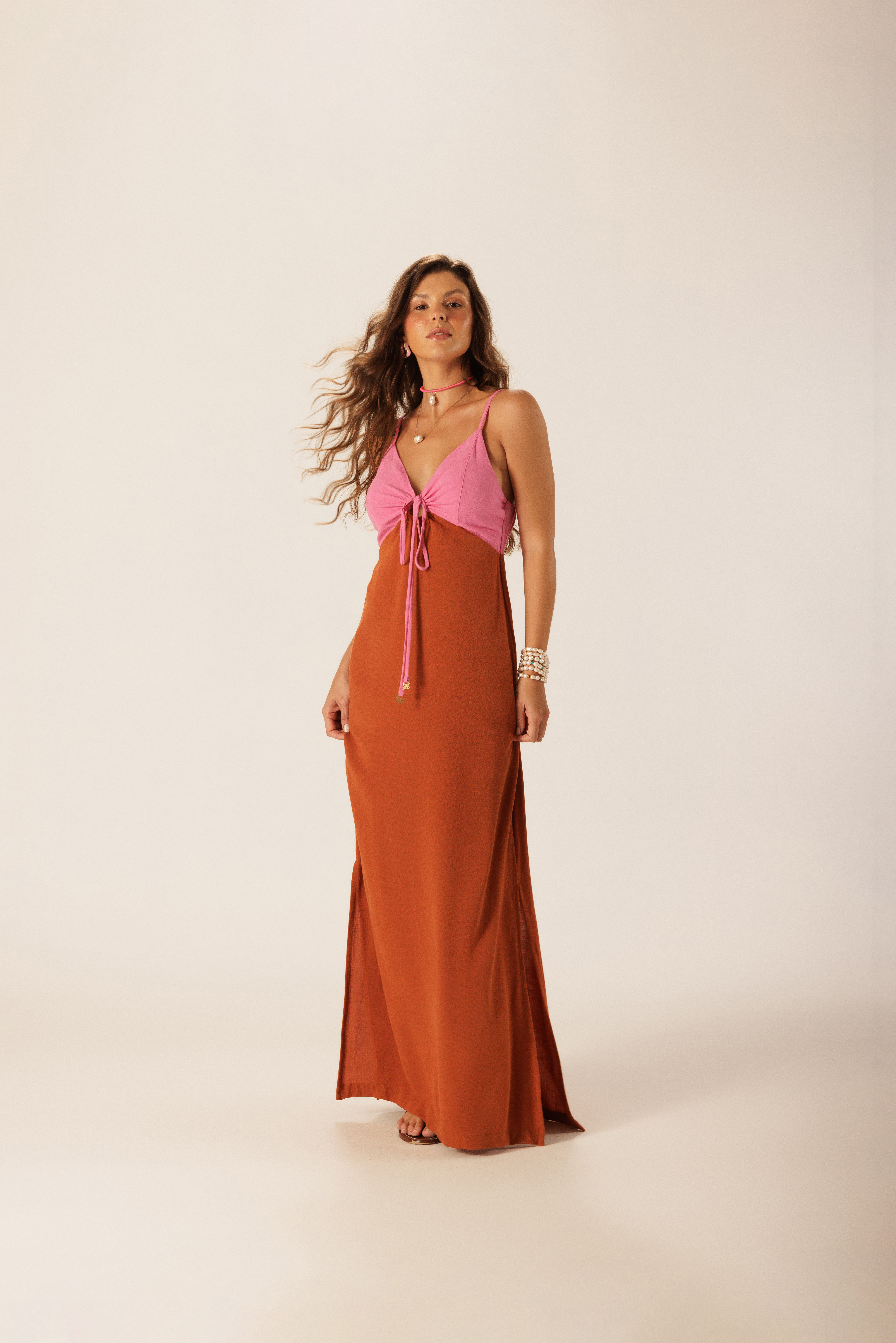 Vestido Bicollor Bela em tecido 100% viscose, com vazado frontal e detalhe de rolotê que ajusta o busto. As fendas laterais trazem leve movimento, enquanto o zíper invisível nas costas garante praticidade ao vestir.