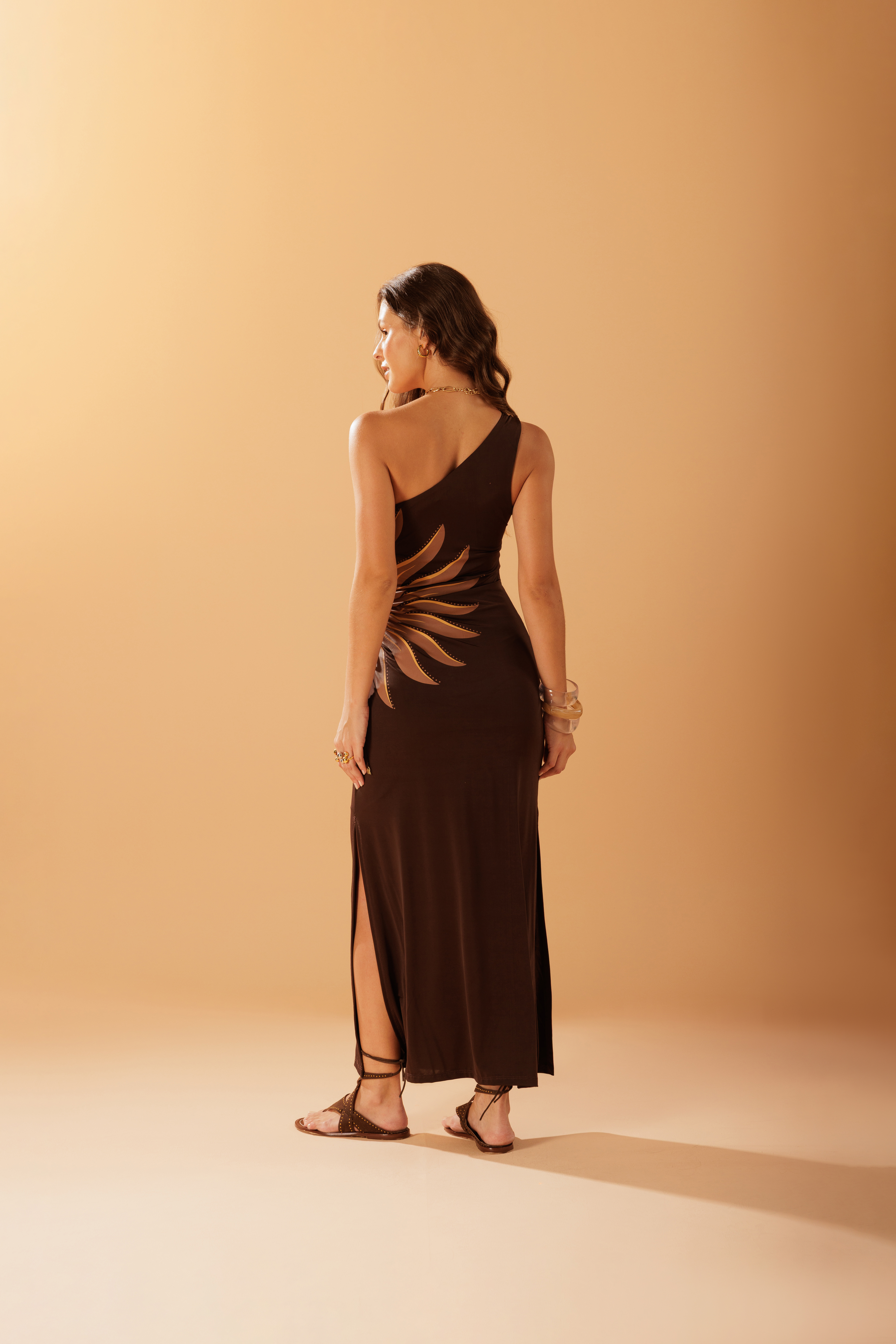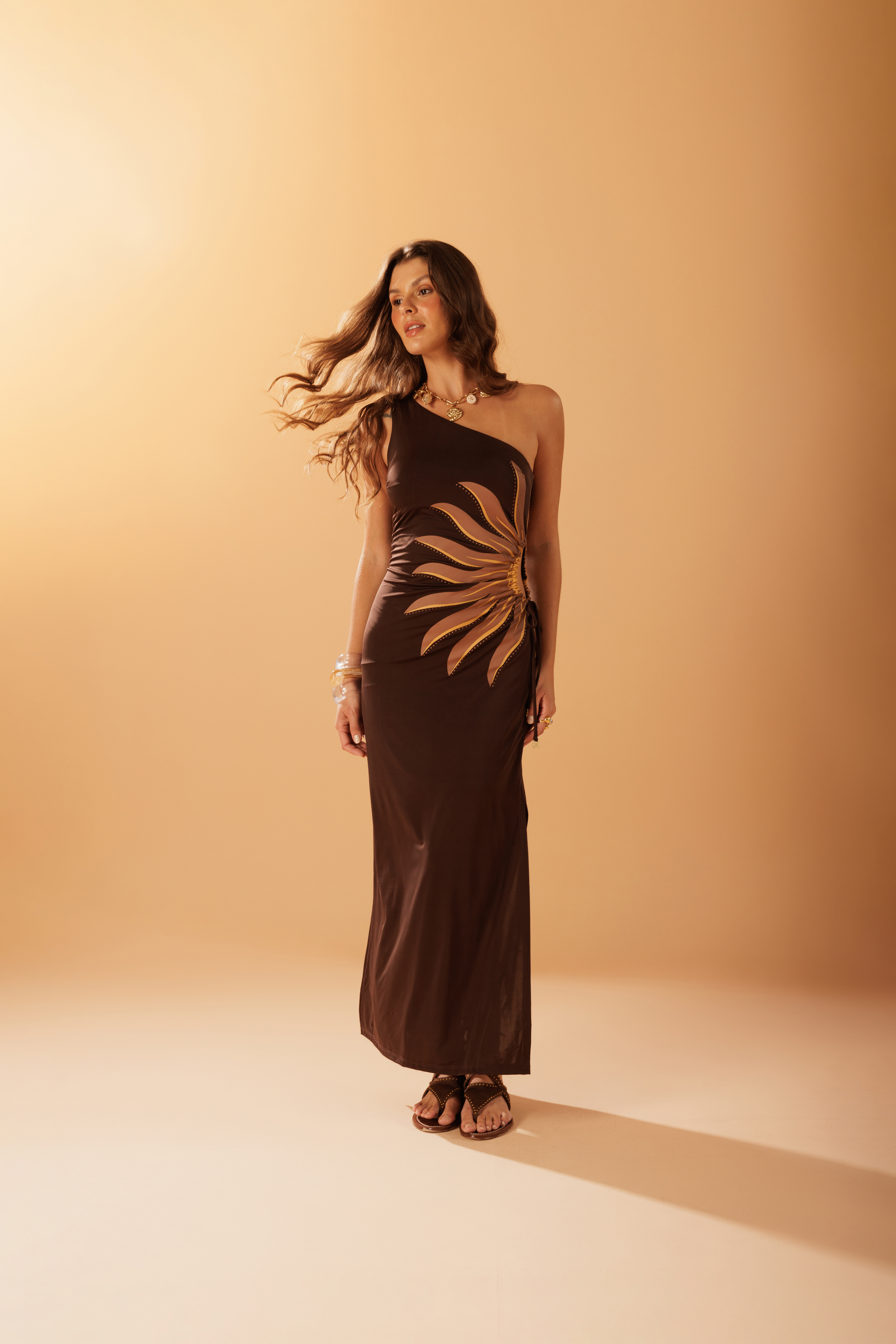 Vestido Midi Vazado Veraneio em tecido 89% poliéster e 11% elastano, com modelagem de um ombro só e fendas que acompanham o movimento. O vazado lateral com silk localizado adiciona destaque ao desenho da peça, mantendo o caimento confortável.