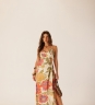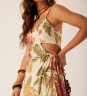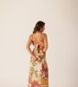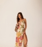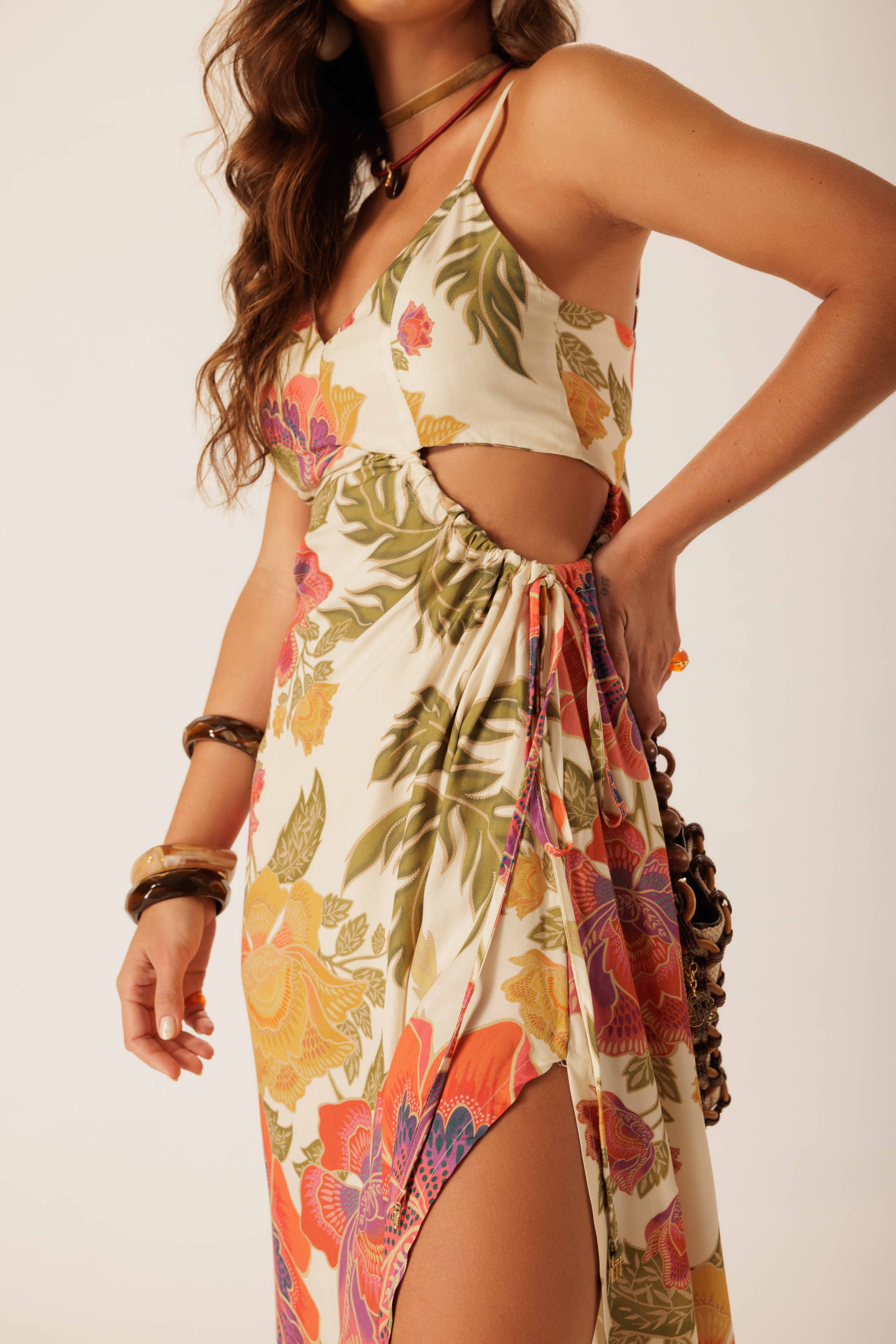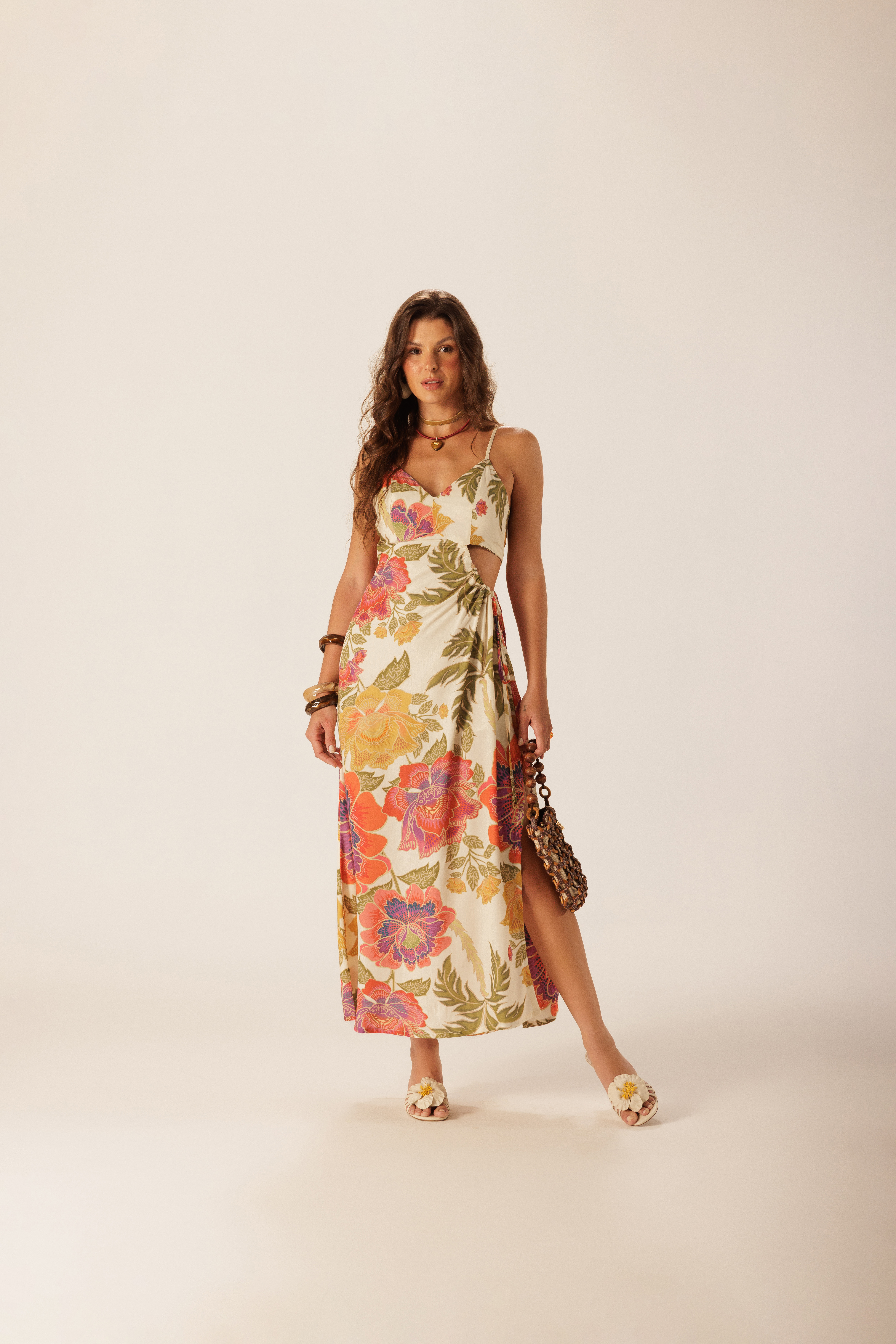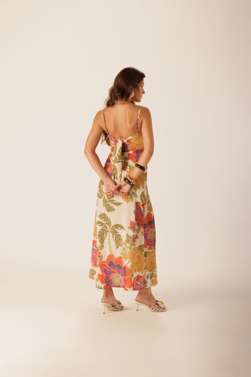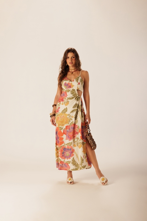 Vestido Midi Delírio Solar em viscose com estampa floral, trazendo vazados nas laterais e nas costas que criam leveza ao visual. A fenda frontal com rolotê e amarração lateral ajusta o caimento e acompanha o movimento do corpo com fluidez.