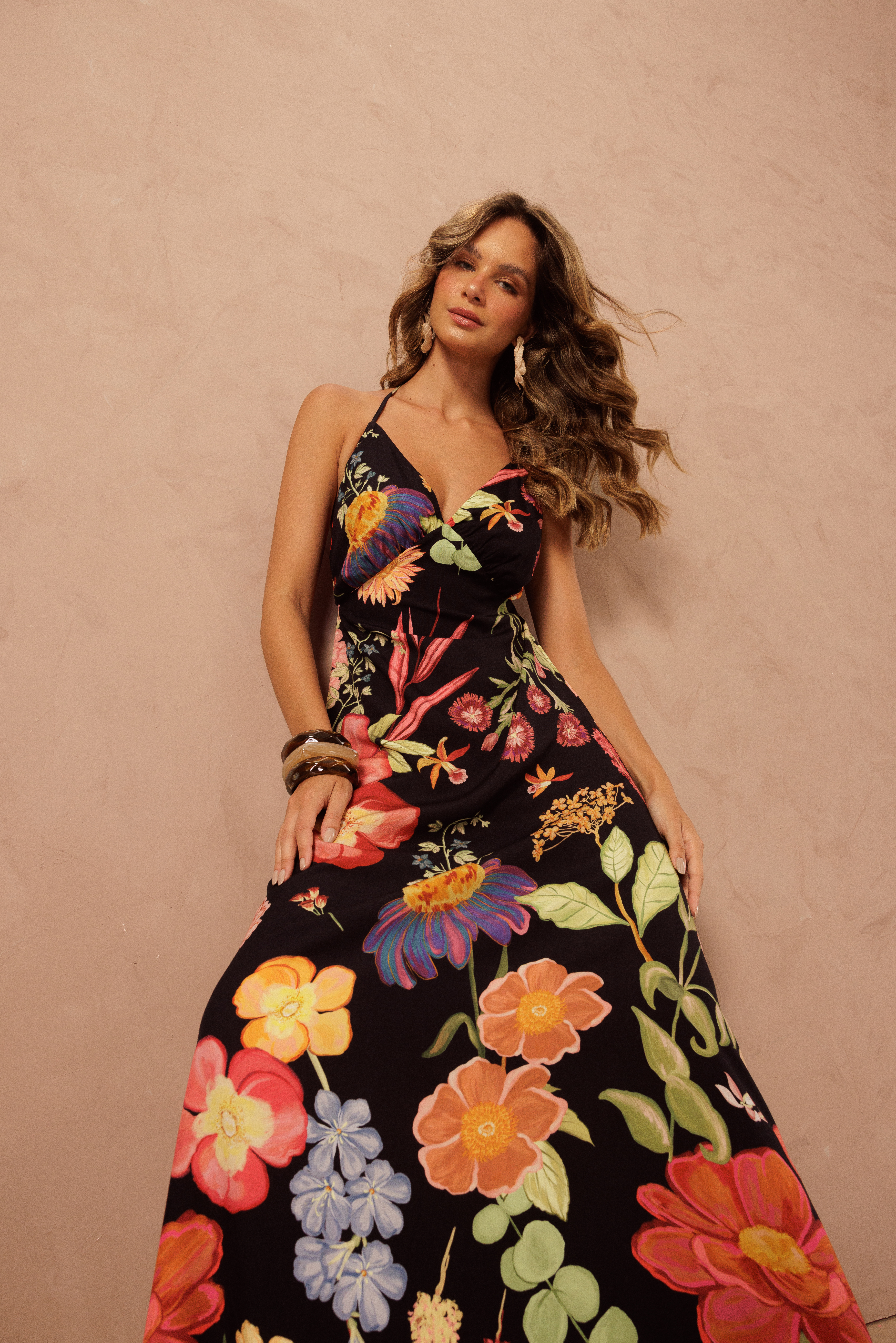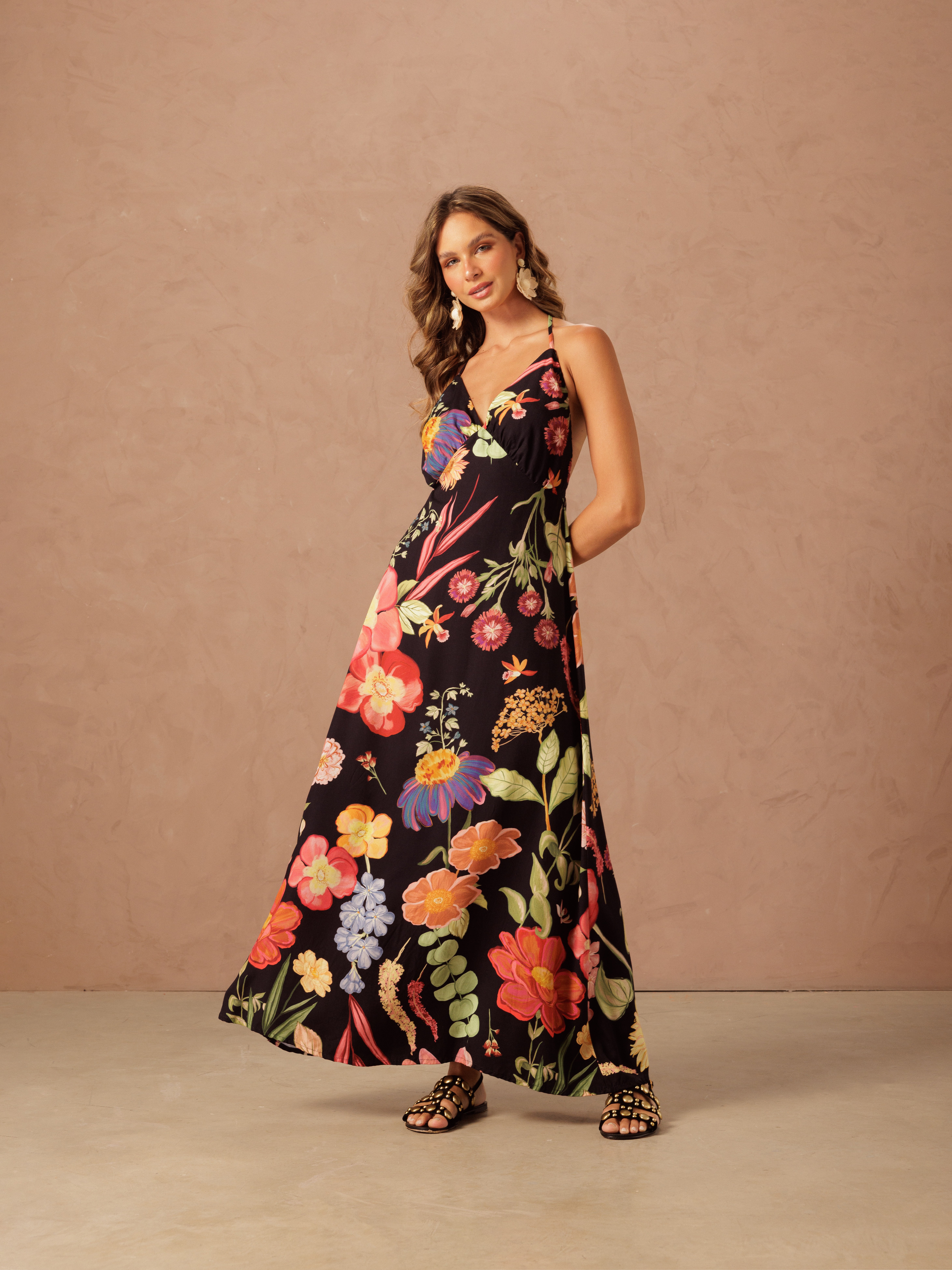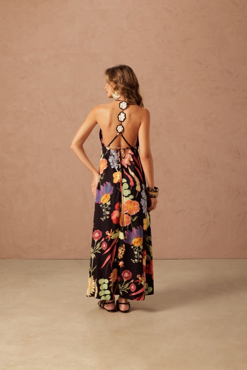 Vestido longo em viscose com estampa exclusiva floral, leve e com caimento fluido. Possui alças finas e decote delicado.
